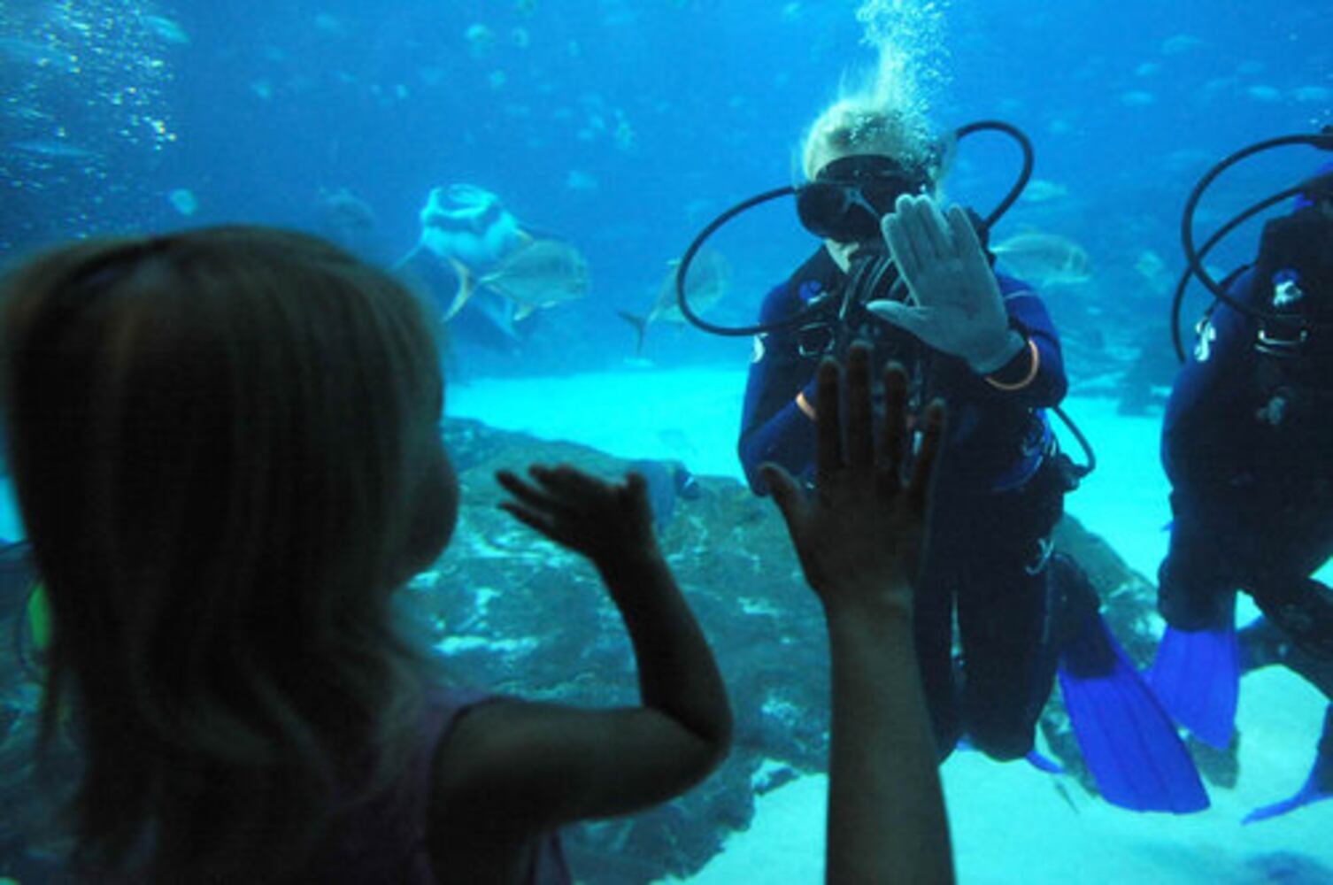 Miss Georgia 2009 Emily Cook, of Marrietta, swam in the Georgia Aquarium's Ocean Voyager exhibit on Wednesday, Aug. 19, 2009. The 6.3 million gallon tank has thousands of fish, including a manta ray, zebra sharks, sawfish, leopard whiprays, bowmouth guitarfish and schools of tarpon, pompano and cownose rays.