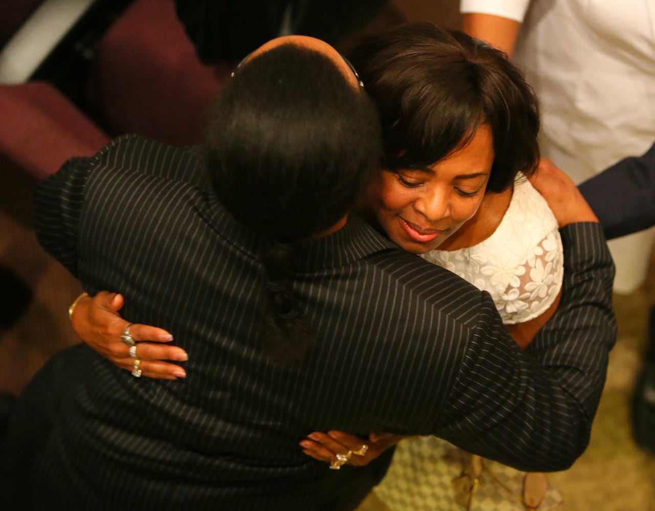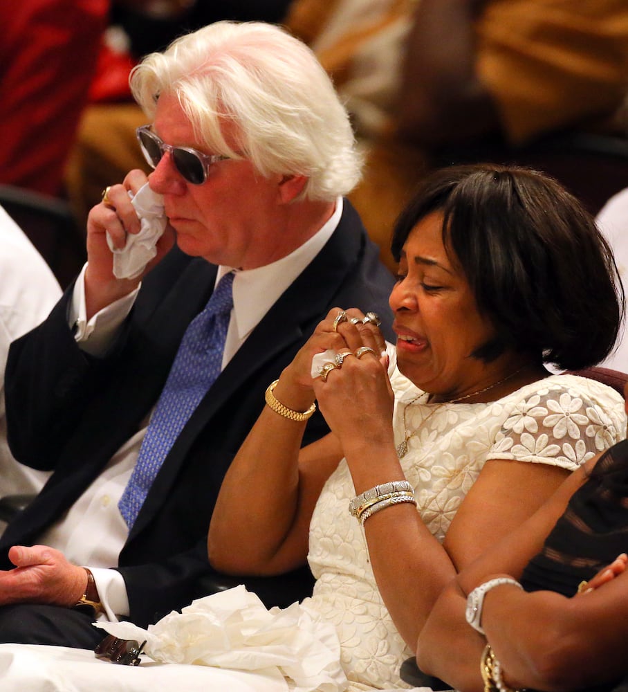 Mourners reach out to touch the coffin of James Christopher Kelly as it is wheeled out of the Jackson Memorial Baptist Church in a recessional at the end of his funeral service on May 9, 2013, in Atlanta.