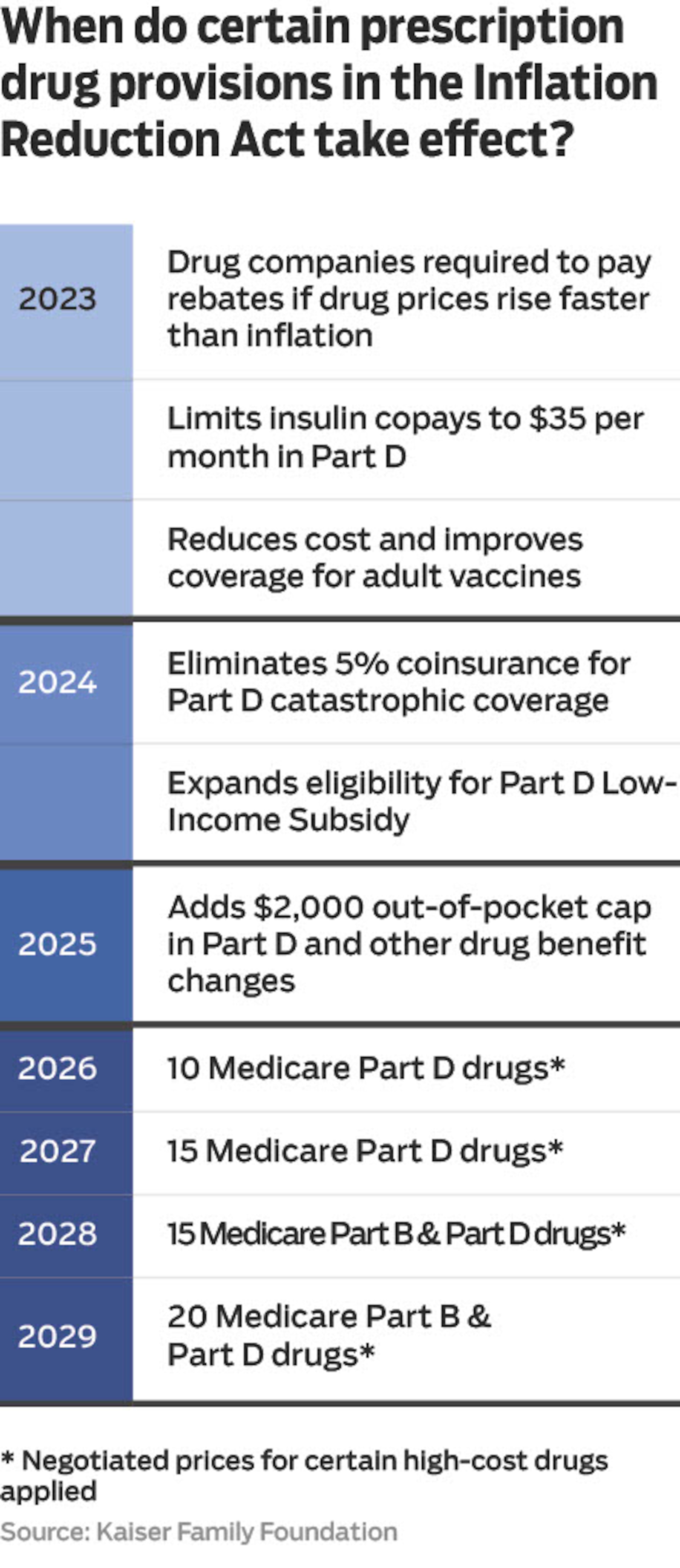 - Effective for 2023: Drug makers must supply rebates to the Centers for Medicare & Medicaid Services in instances where drug price increases exceed the rate of inflation. While there doesn’t appear to be a specific start date, KFF.org reported it begins next year.