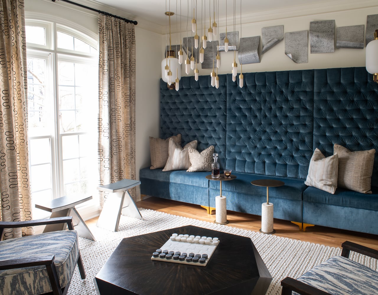 “In smaller condos or apartments eliminating a dining table and using a console on the back of a sofa,” they said. “Using counter stools or tall ottomans that slide under the table you can create an instant intimate dining space. If you have a small combination room (serves multiple purposes) consider using a banquet along a wall to add seating for a dining area which allows you to move the table closer to the wall. When using a banquet don’t be afraid to make it taller than you might first think, 6′ is not too tall in a small room, the scale makes the room feel larger.