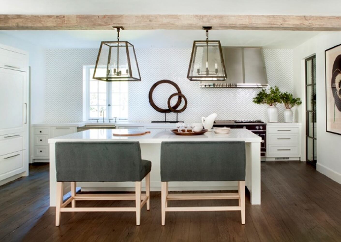 “For me, it is about the ‘jewelry’ in the kitchen,” the design studio said. “I like to keep everything calm and quiet and then make the room pop with unique and unexpected light fixtures, cabinet hardware, the hood and range. These are the conversation pieces!”