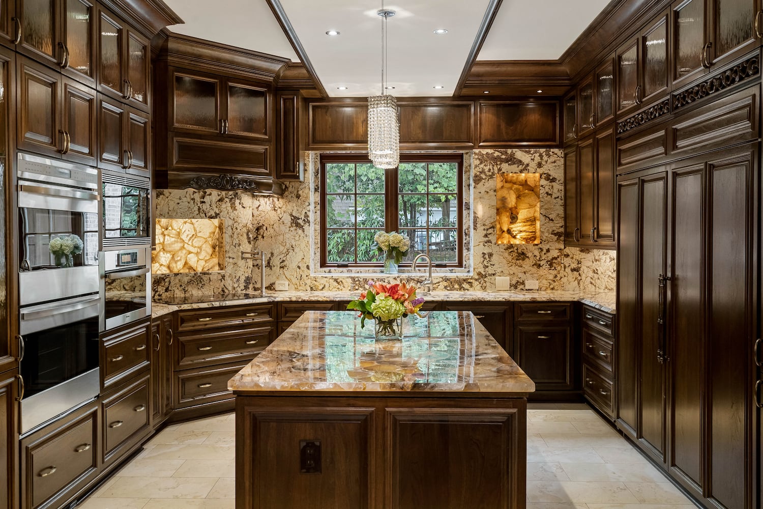 “The main level owner’s suite boasts a barrel vault ceiling, enormous walk-in closet, and a built-in spa complete with a hot tub, steam room and sauna leading to the pool area,” the listing said. “The three upper bedrooms each feature ensuite baths, and also include a private living quarters with a full kitchen, laundry room, and bedroom suite. The upper level has an In-Law/Au-Pair suite, with a private bathroom, separate entrance, and direct single car garage access. The kitchen combines gorgeous, modern design with state-of-the-art appliances to create a space that is equally inviting and practical.”