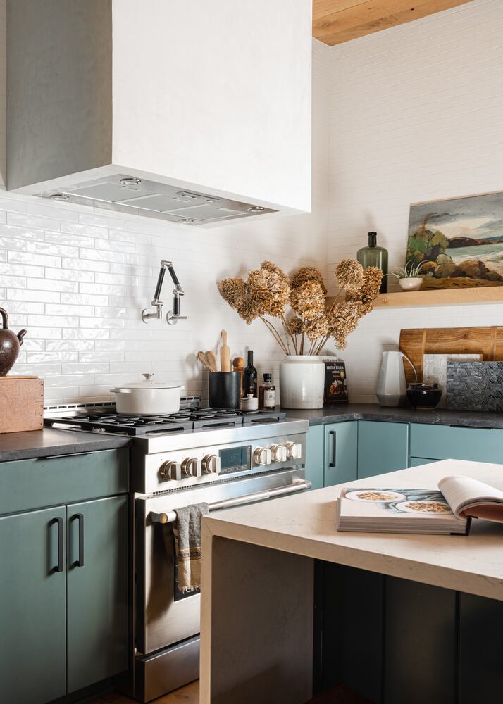 The interior designer described the kitchen as earthy, modern and casual. The calming blues of the cabinets pop against the white walls of the room, and the breakfast table dazzles with its natural wood flair.