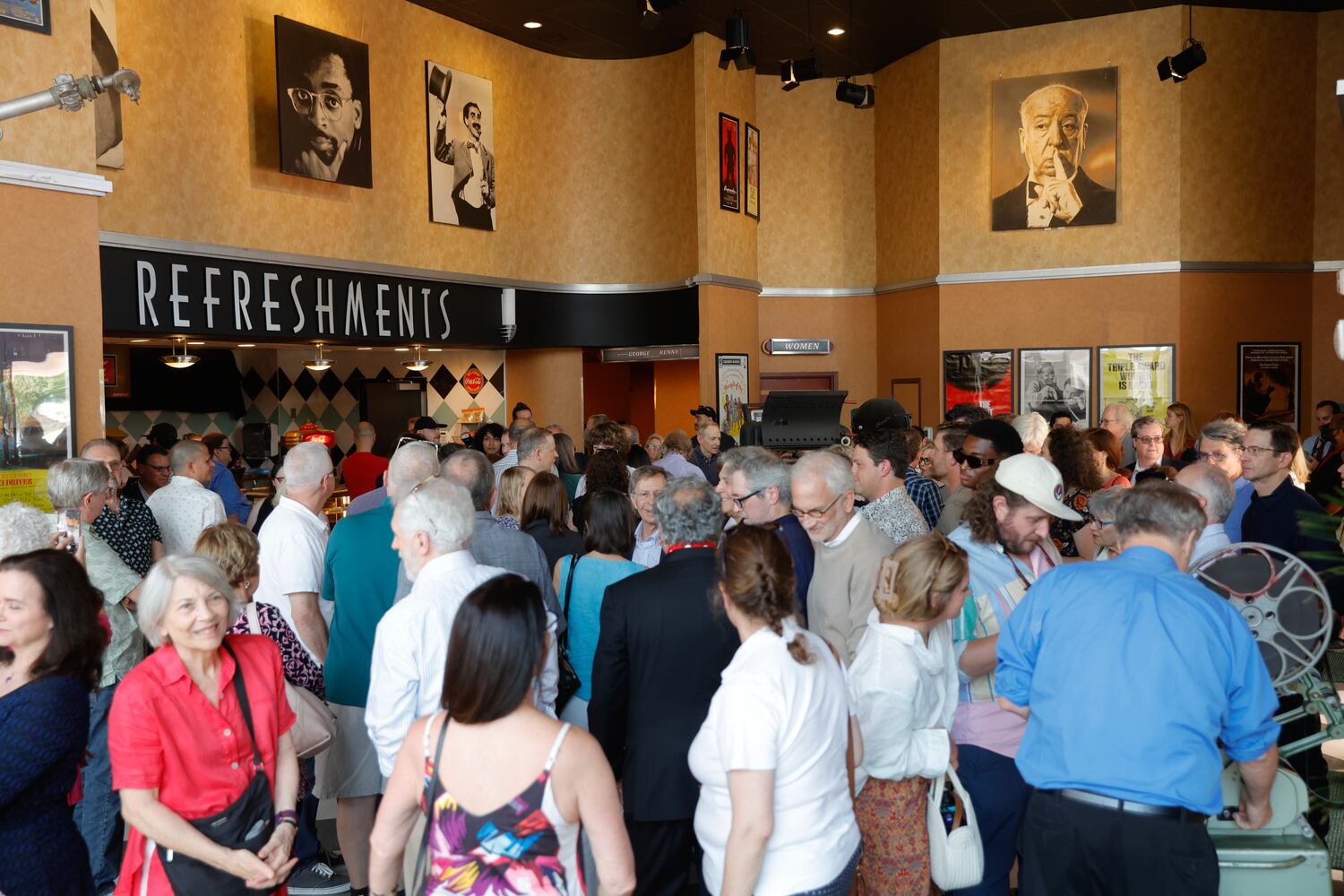 Tara Theatre owner Christopher Escobar (center) celebrates with supporters after the ribbon cutting during the grand reopening on Thursday, May 25, 2023. The theatre is reopening after being shut down last November. (Natrice Miller/natrice.miller@ajc.com)