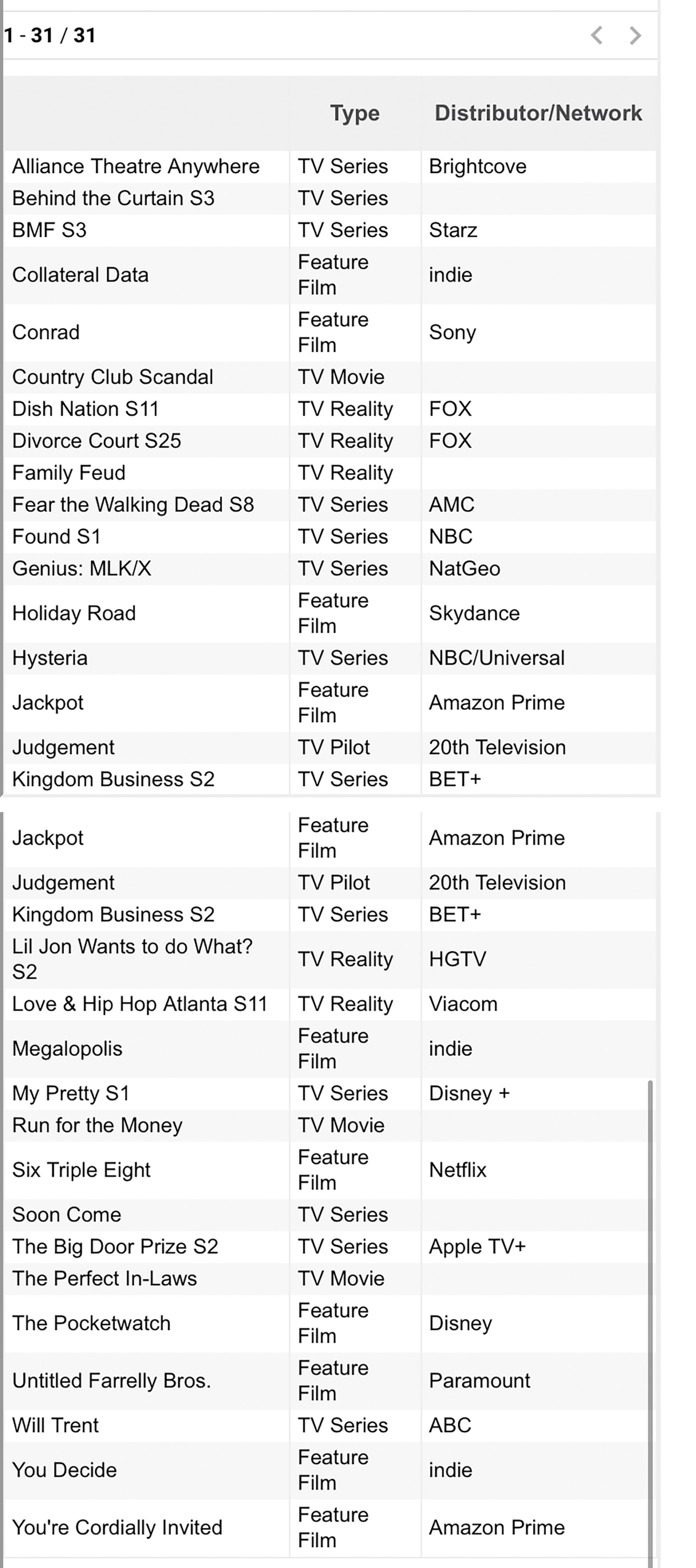 The Georgia film office provides an ever-changing list of active productions, but it is not necessarily complete because production companies are not obligated to update the Georgia film office. For instance, Bravo recently spent months shooting “The Real Housewives of Atlanta” season 15 but it only briefly showed up on the list. If a company requests the production stay off the list or use a pseudonym, the film office will oblige. I also glean some titles from productionlist.com and other sources. (Georgia does provide an alphabetical directory of every production it has ever kept track of here.)
