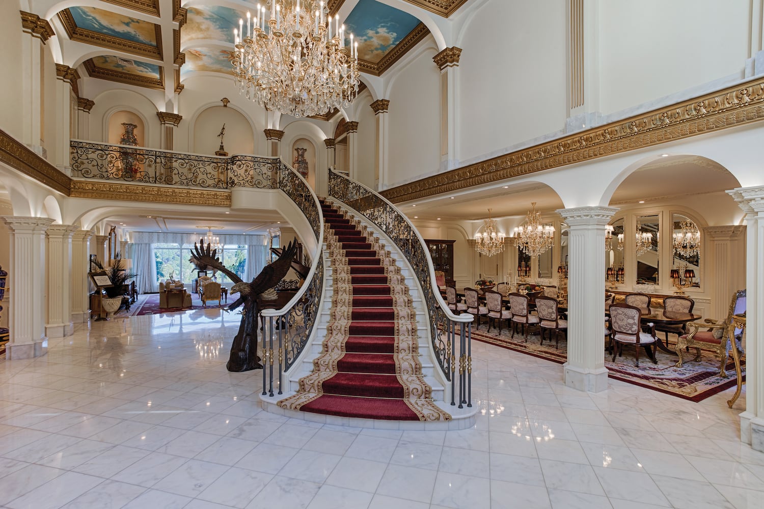 The master suite was featured on HGTV’s “Million Dollar Rooms.” The $5 million suite is divided into seven areas: a master bedroom, master bathroom, sitting room, his and her dressing rooms, meditation room, and a craft room. All of the lighting fixtures, including the Swarovski crystal chandaliers, were imported from Italy and cost $300,000. The gold inlay crown molding in the suite was $200,000.