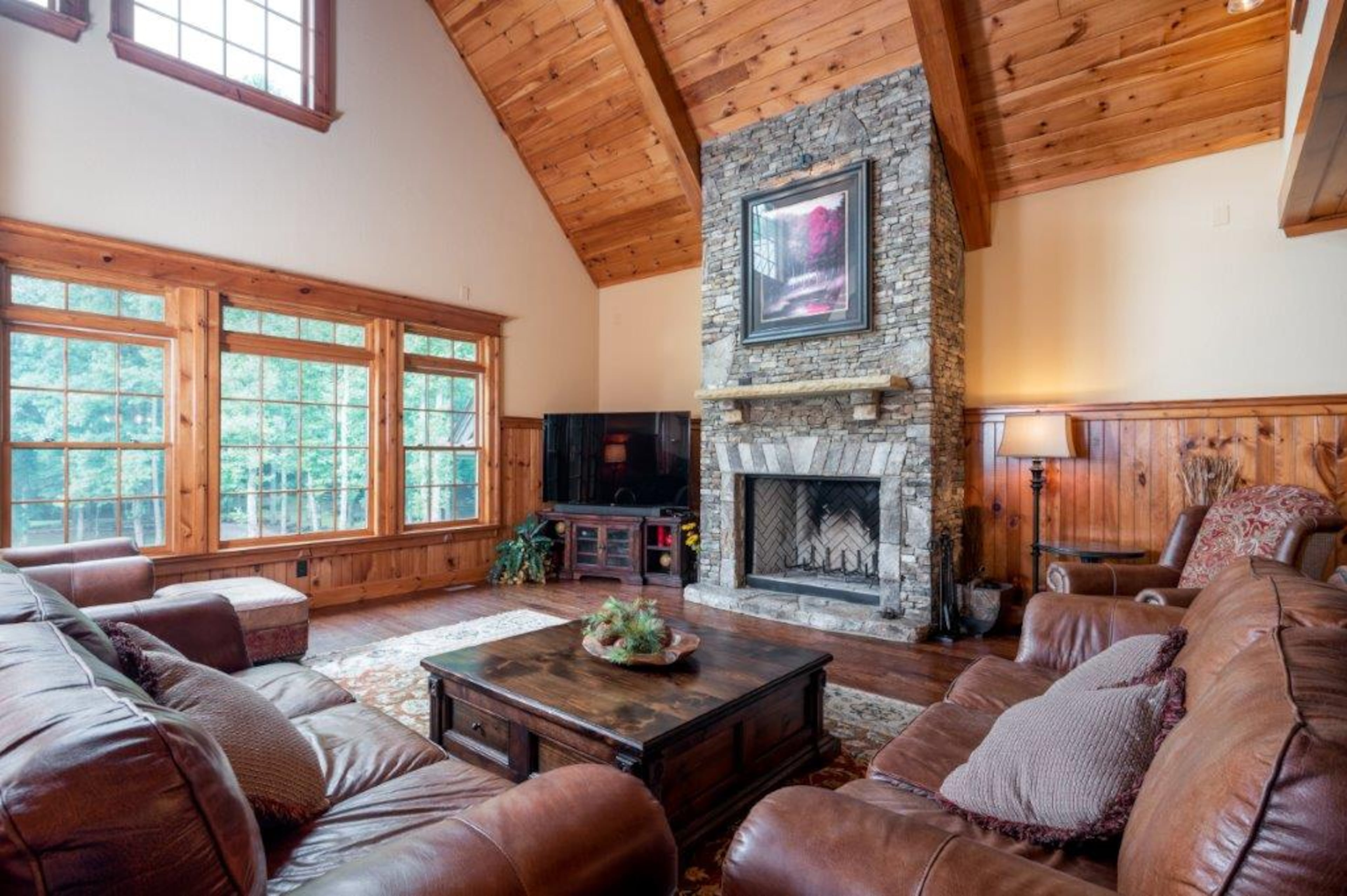 Resting atop 93 acres, the 4,677-square-foot cabin features four fireplaces and five garage spaces. A gazebo lies just beyond the home for afternoon lounging on warm summer days and spring mornings. Built in the 1930s, the cabin has been completely renovated for modern life.