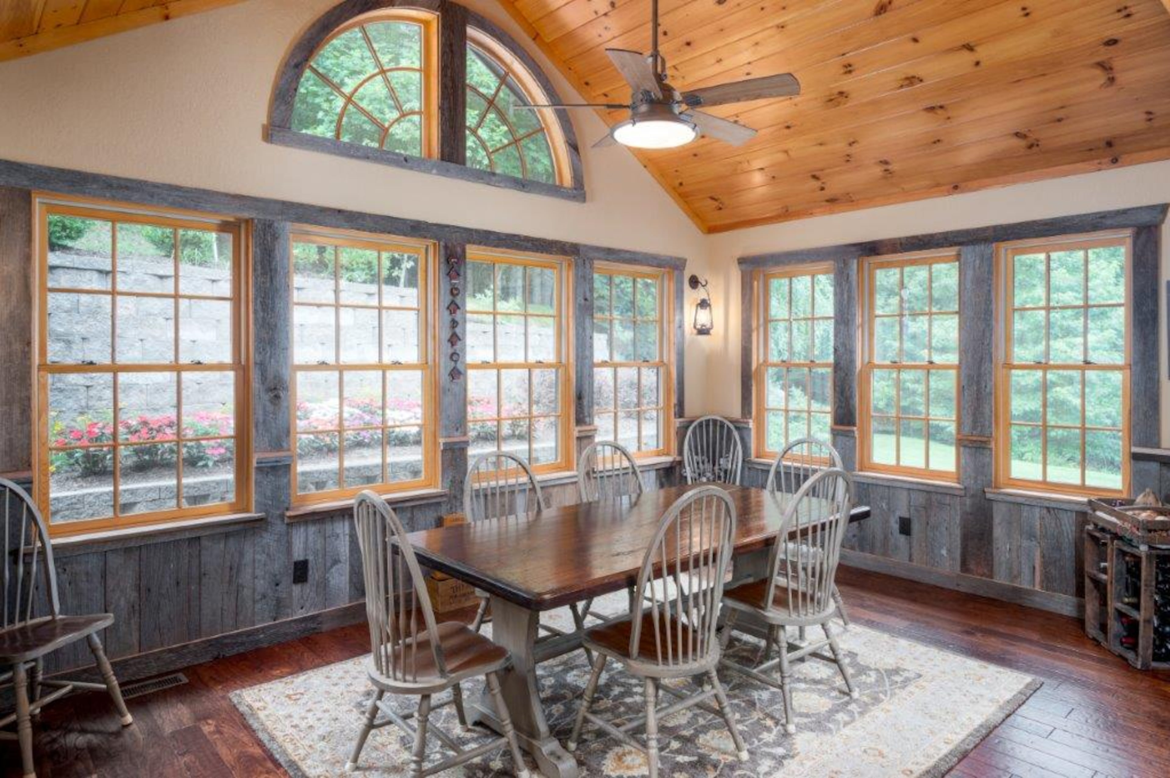 “Drawn by the site and the authenticity of the cabin and old barn, we decided to save both and rebuild from top to bottom,” the sellers told realtor Sandy Wilbanks. “Our goal was to maintain the original character while completely modernizing with new foundations, plumbing and septic system, electric, HVAC, windows, doors, and a new roof. We sourced 120-year-old barn siding to rebuild the interior. The result was transformative not just for the rebirth of the house and barn but also for us.”