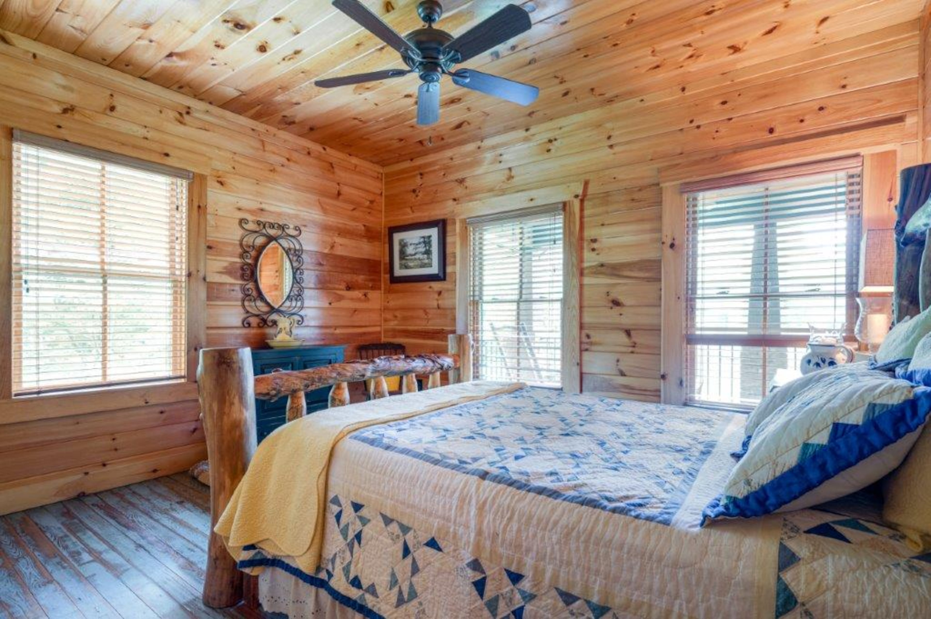 The nearby kitchen features custom knotty cherry cabinets, which flank a massive granite island. It serves as a perfect serving space for even large families. The rustic main bedroom features his and hers closet space and ample window space for those scenic views.