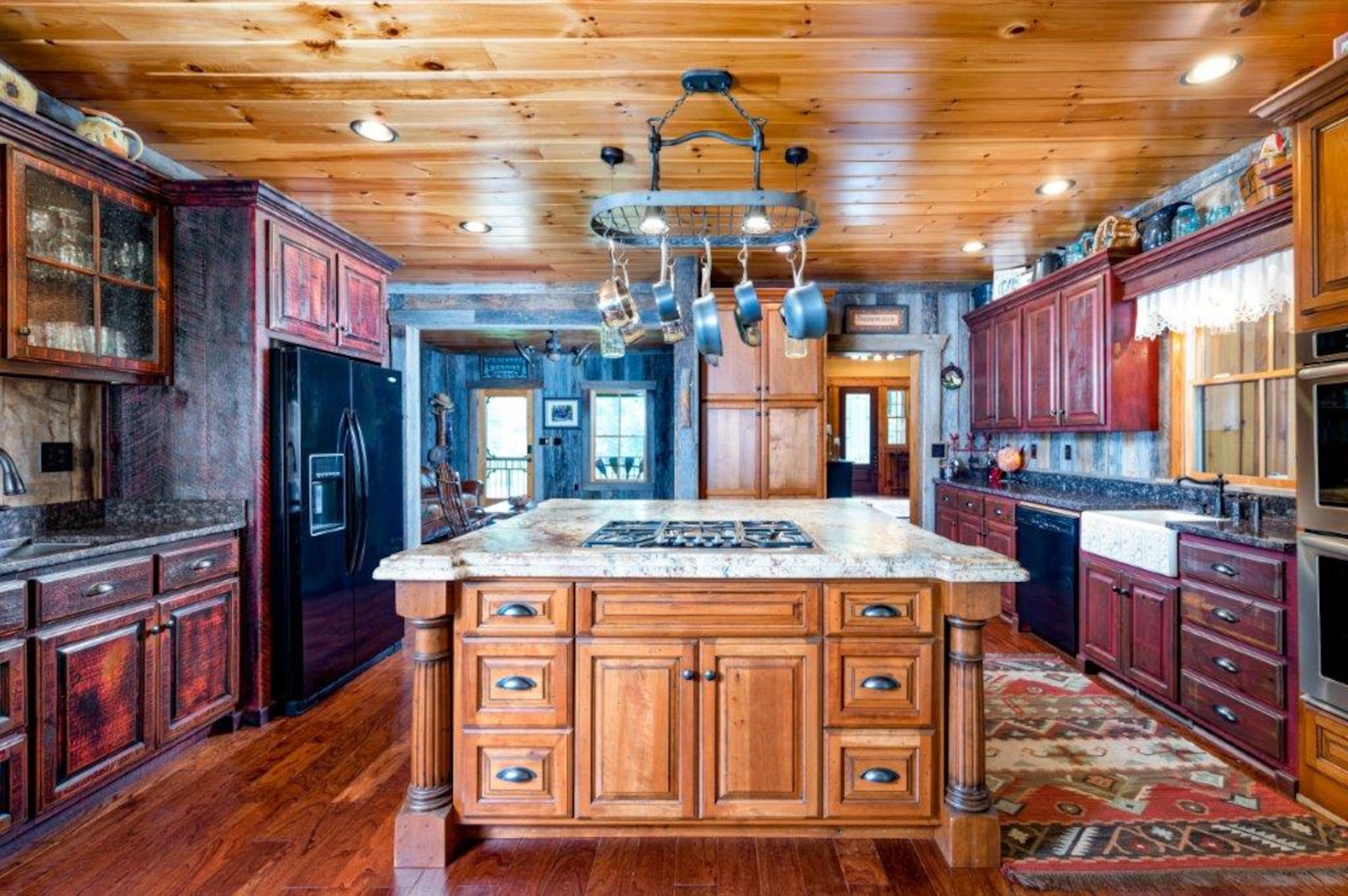 Once you are done exploring the nearby mountainside, creek, pond, vineyard, hiking trails and gentleman’s farm, you can cross into the cabin’s threshold to discover a natural wood masterpiece warmed by a nearby stone fireplace. As you pass the immense living space, you will find a dining room surrounded by beautifully paned windows for ample natural lighting and views of the countryside.