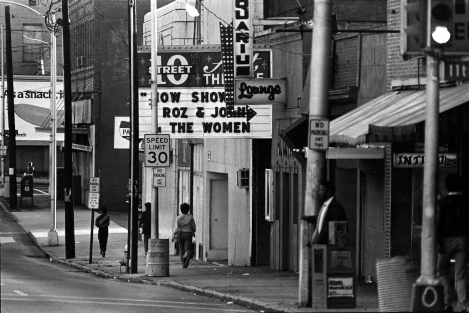 'The Strip' on Peachtree at 10th Street, 1978. The original caption noted that, "Many runaways who come to Atlanta head for 'The Strip' at Peachtree and 10th."