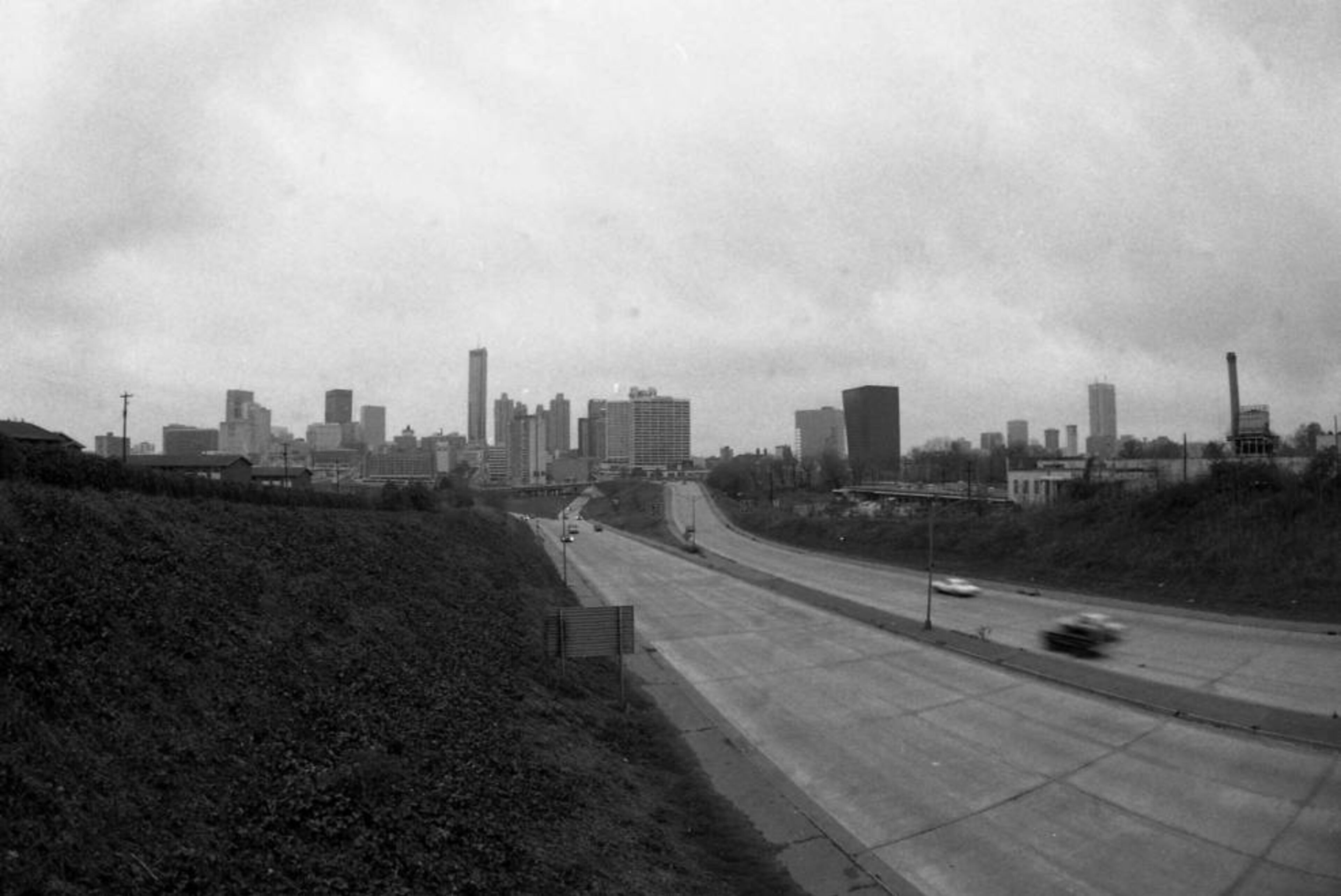 ATLANTA, GA -- Interstate 20, between Ashby and Peters Streets, facing west. Shoulder and median work are cited as the cause for traffic atery being kept closed. Road signs warn trespassers to stay away. (Bob Dendy/AJC staff) 1966