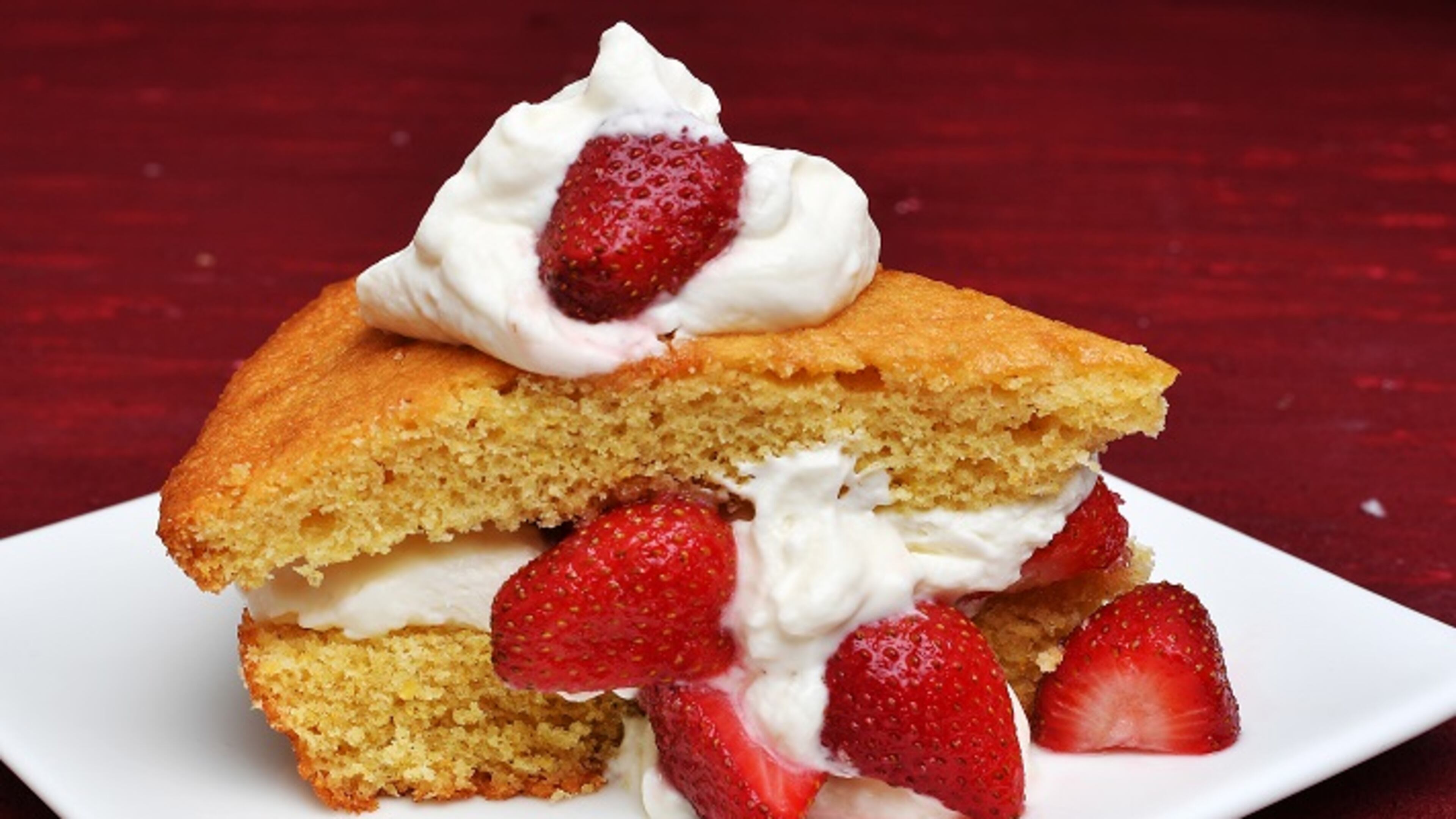 It was back to square one for me: great cornmeal cake, wedges cut in half, filled with whipped cream and lots of brightly colored, fresh, fragrant strawberries. And it was back to deliciousness.