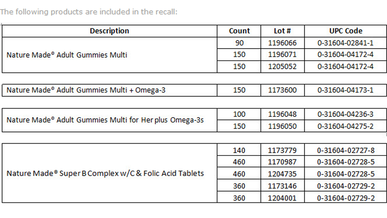 Pharmavite LLC is recalling specific Nature Made gummy and tablet vitamins due to possible salmonella or staphylococcus aureus contamination.