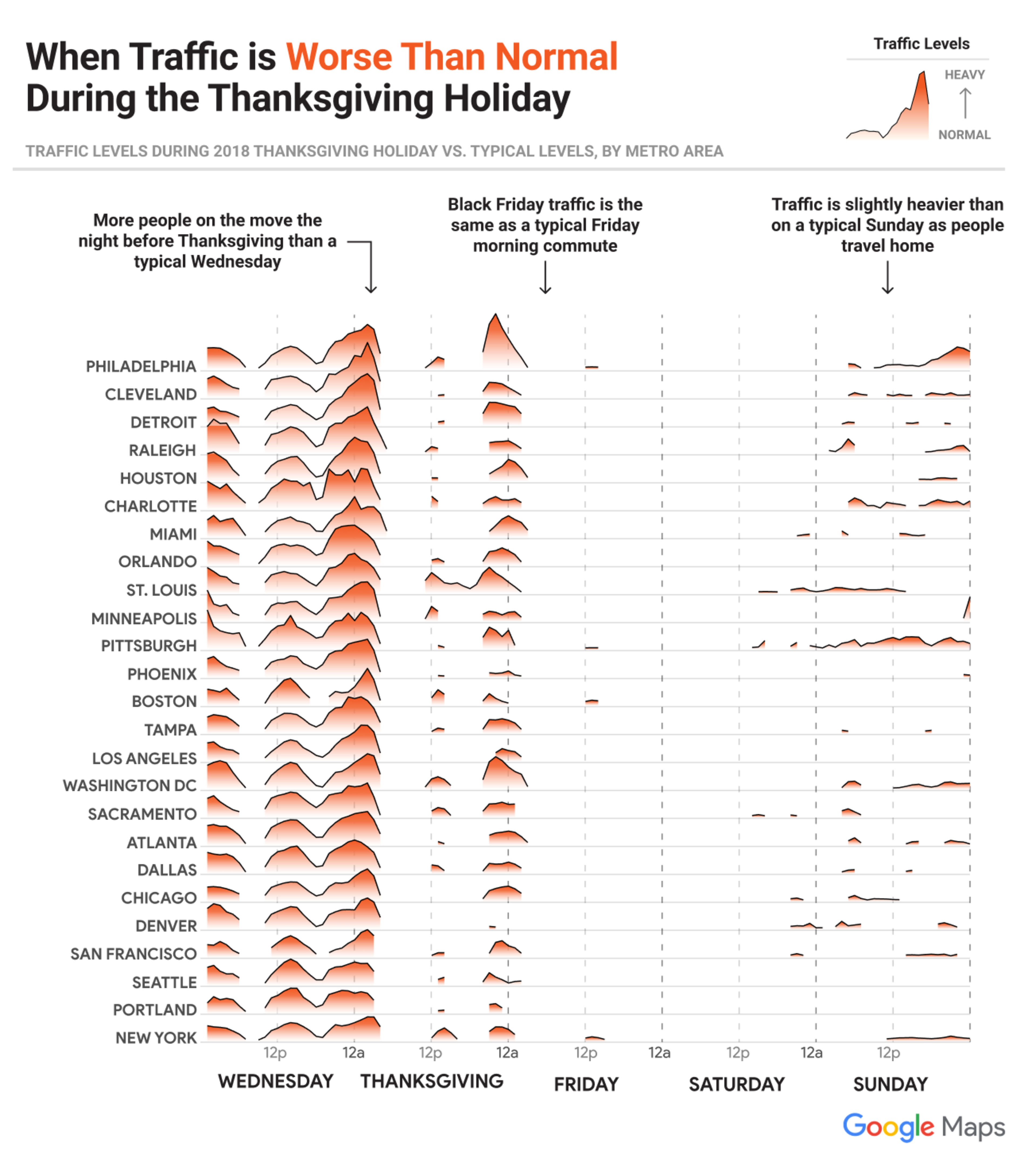 To figure out the best times to drive, Google considered the holiday period to start the Wednesday before Thanksgiving and end the Sunday after, excluding noon to 11pm on Thanksgiving Day. Google analyzed the volume of cars on the road at a given time, as determined by the speed and location of Android phones that had location services enabled. All traffic information is anonymous and taken in aggregate for 25 U.S. cities.