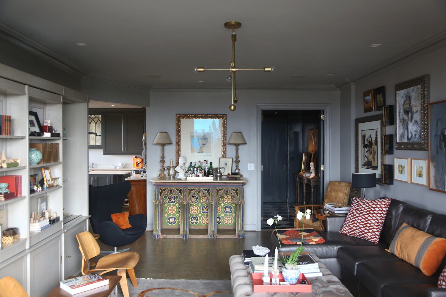 Favorite interior design elements: They were inspired by the collected look in mid-century New York and Parisian apartments, Steve said. For example, the living room's eclectic vibe comes from a gothic altar from southern France used as a bar, a Biedermeier-style side table from Sweden, a Le Corbusier lounge chair, a Noguchi coffee table, Eames lounge chairs, a Jacobsen egg chair, Louis IV-style armchairs and an American Leather sleeper sofa.