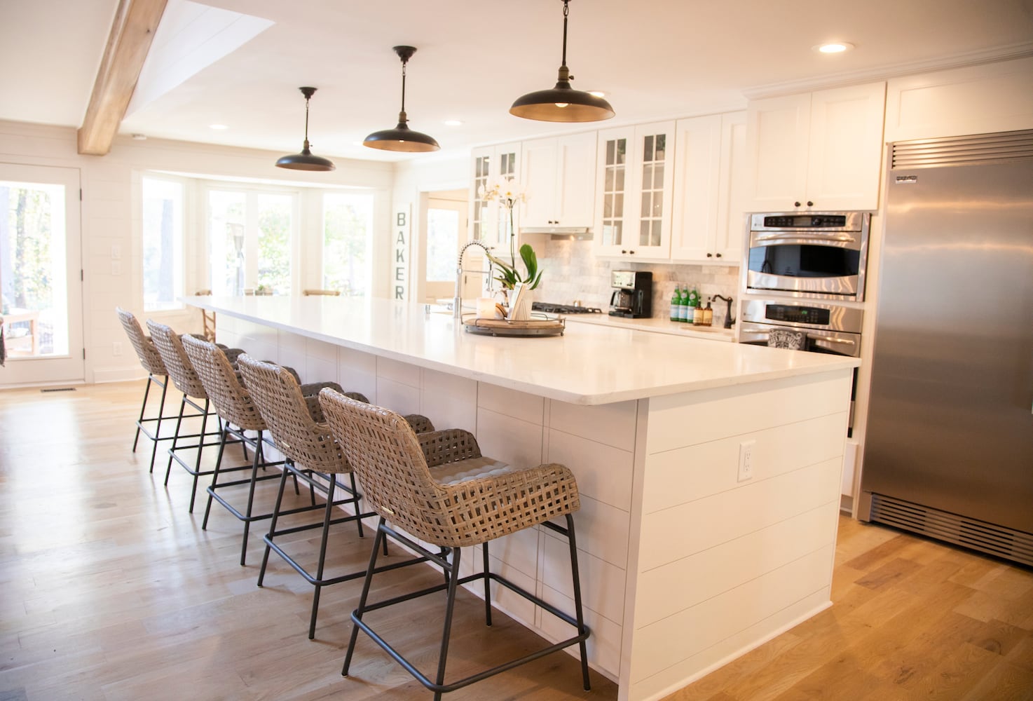 Renovations: Full interior and exterior renovations included adding a top level with two bedroom and baths, the patio overlooking the pool and golf course, and an additional connected garage with a bedroom above it. The kitchen renovations introduced details like shiplap walls, as well as Frigidaire Pro appliances, a farmhouse sink from Vigo, cabinets with pulls and knobs from RH, and a stainless steel faucet from Pfister.