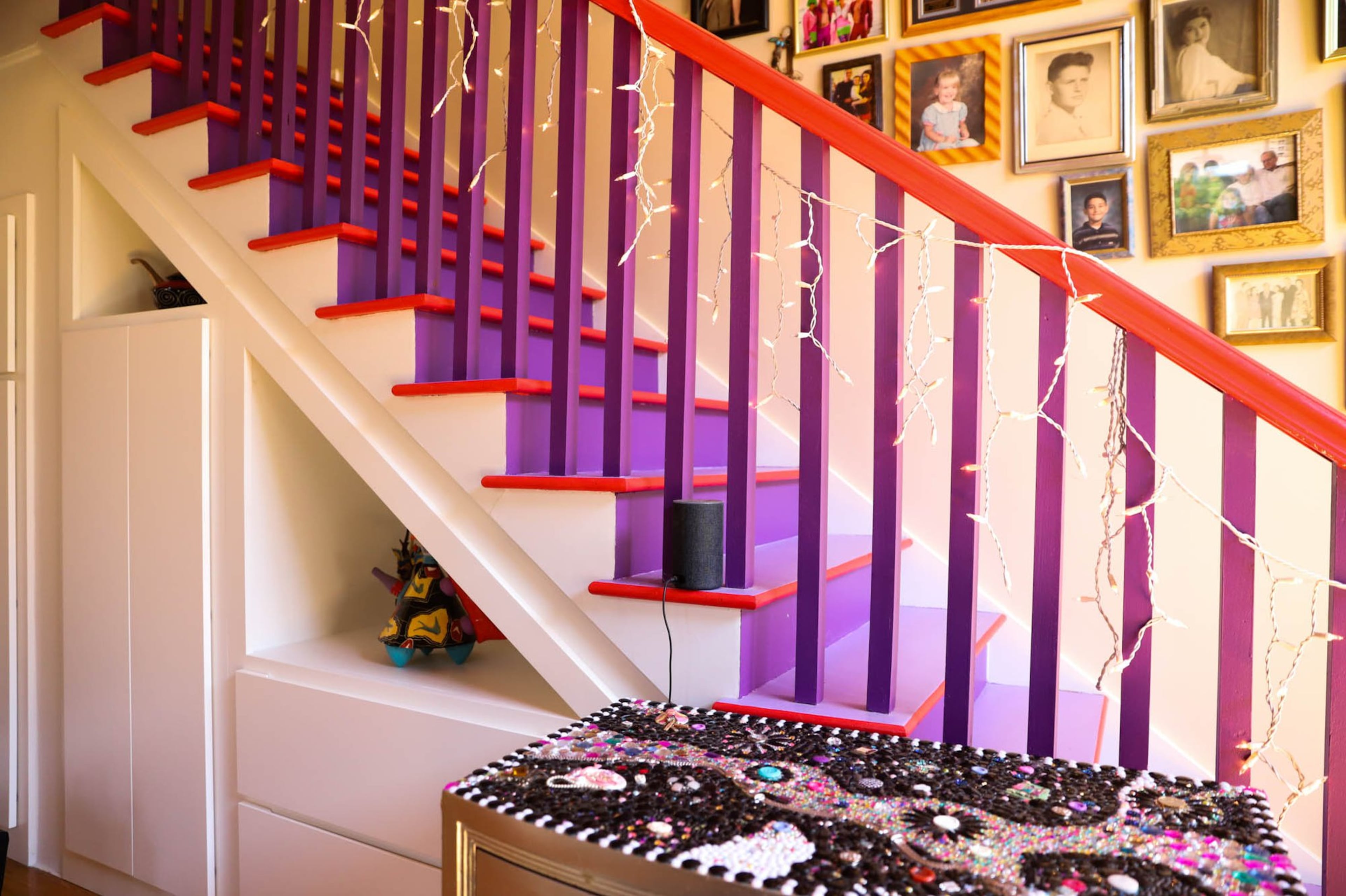 Resources: Furniture and decor from Wayfair, Rooms To Go, Bova Furniture, Overland Sheepskin Co., Target and Hobby Lobby. Shades by Smith and Noble. Track lighting by Chris Myers of enLIGHTen Ltd in Telluride, Colorado. Paint on the stairs is Sherwin-Williams Impulsive Purple, Brave Purple and a bright red.