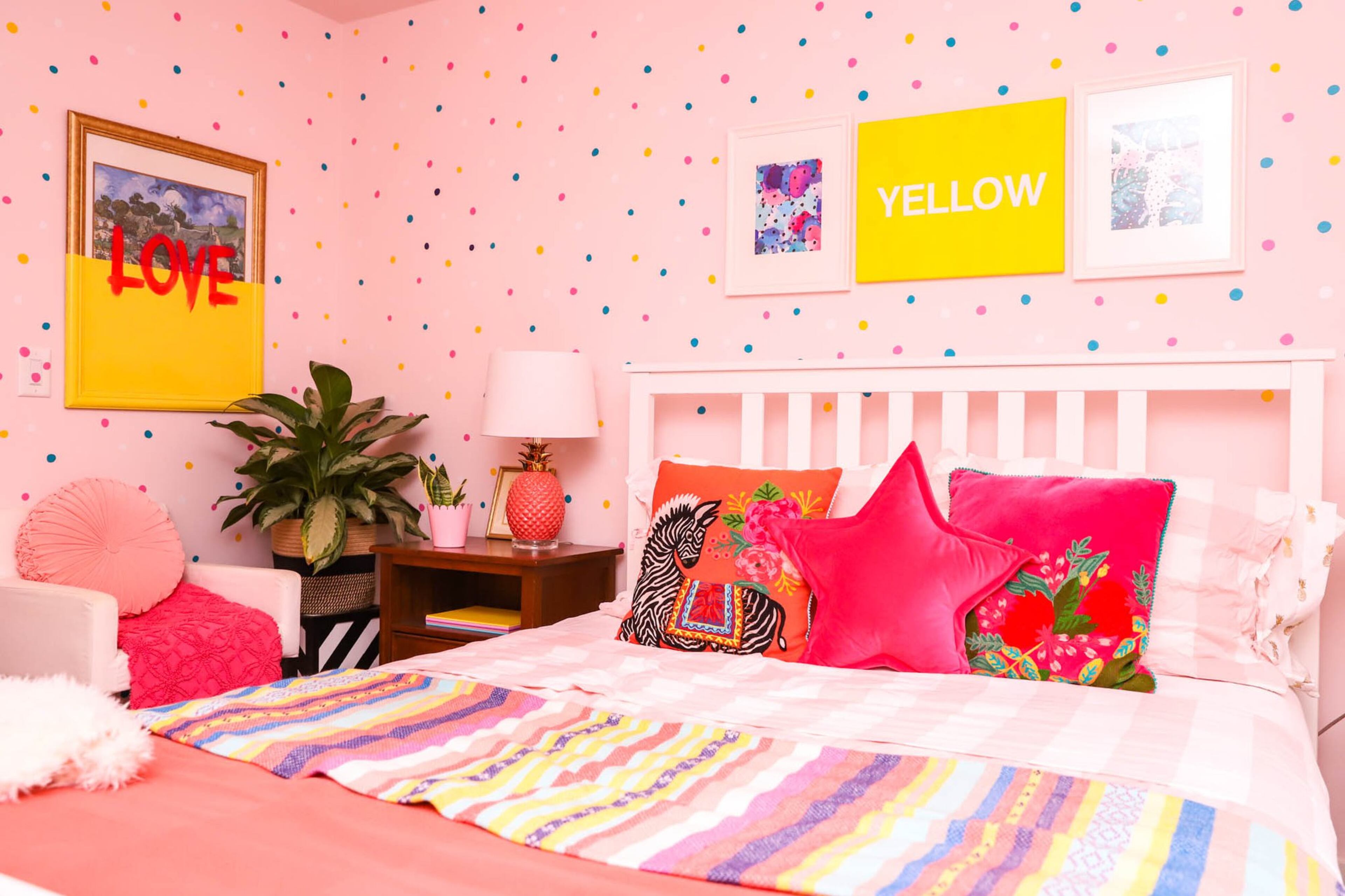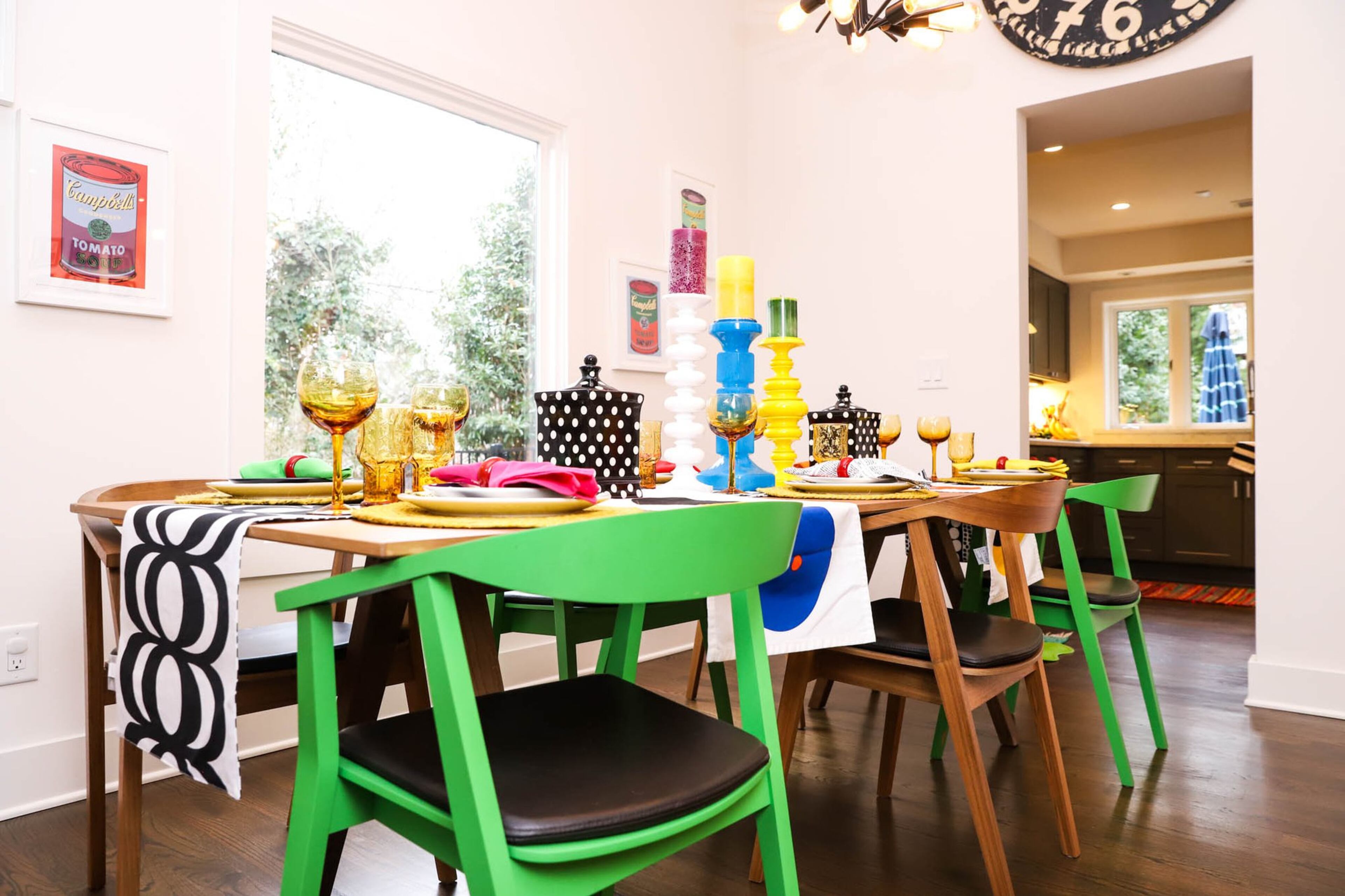 Jeff and Paola’s style also includes pop art pieces, like the prints of art by Andy Warhol in the family room, and bright art like the pieces from Great Big Canvas throughout the space and the Frida Kahlo art in the master bedroom by Heather Felder and Ana Paula Hoppe. Paola also added in her own personal artistic touch by painting the patterned walls that can be found throughout the home with straight stripes of bright color.