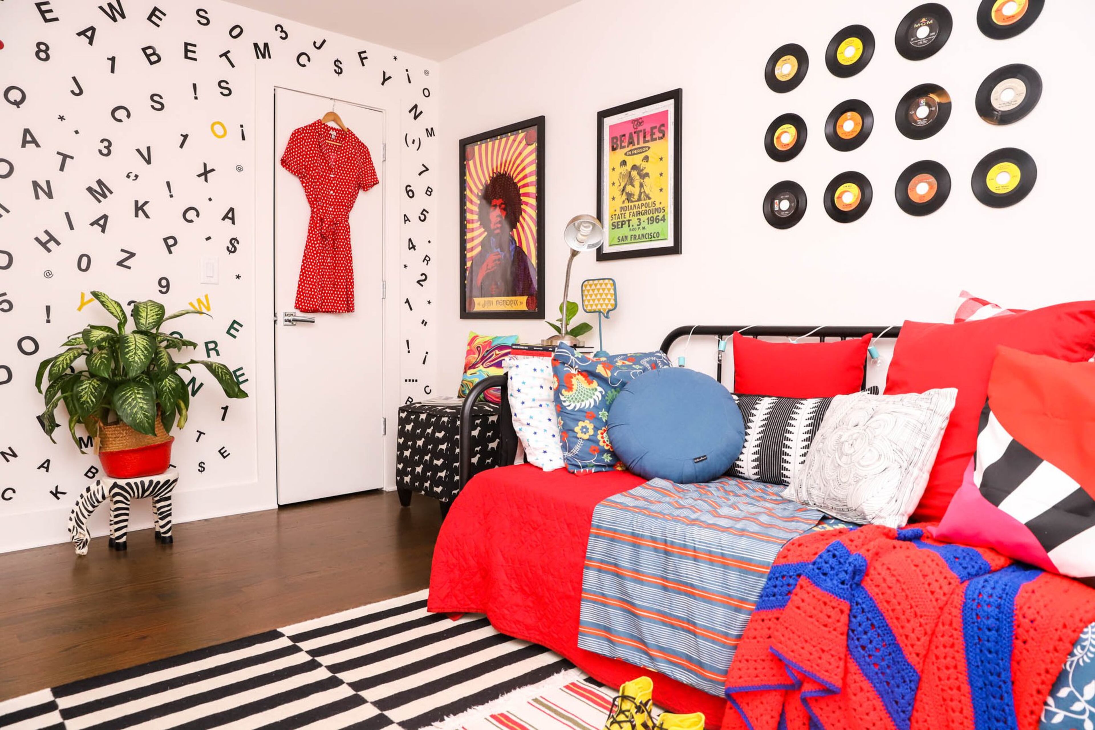 The Roders filled the home with their modern, pop art-inspired style, focusing on primary colors contrasted with black and white patterns.