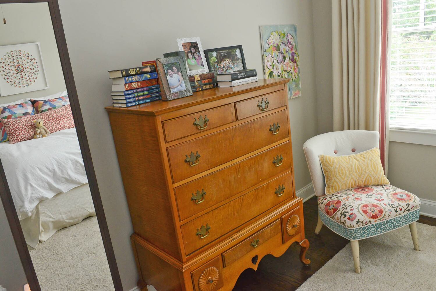 Favorite interior design elements: Custom furniture, like the office console by Trinity Mercantile & Design, reupholstered dining room chairs and a chair in Avery's room, and vintage pieces, such as a Queen Anne chair and bureau from Kate's grandmother, and Kate's childhood furniture.