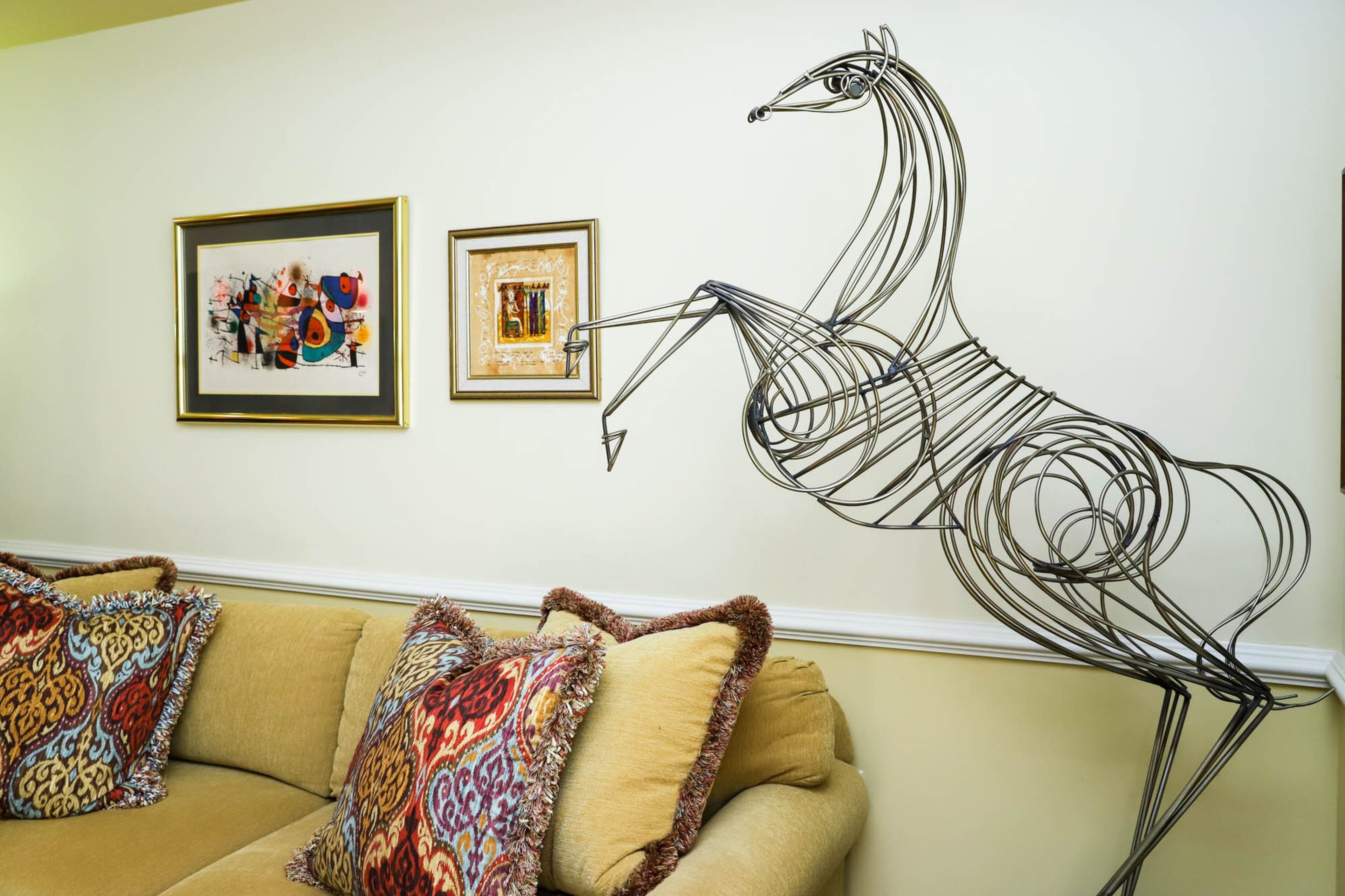 They gave some of Jaffe’s decor an update, like the reupholstered gold velour sofa in the living room, and picked out pieces that gave the space pizazz, like the 6-foot tall wire horse sculpture from ADAC by the sofa.