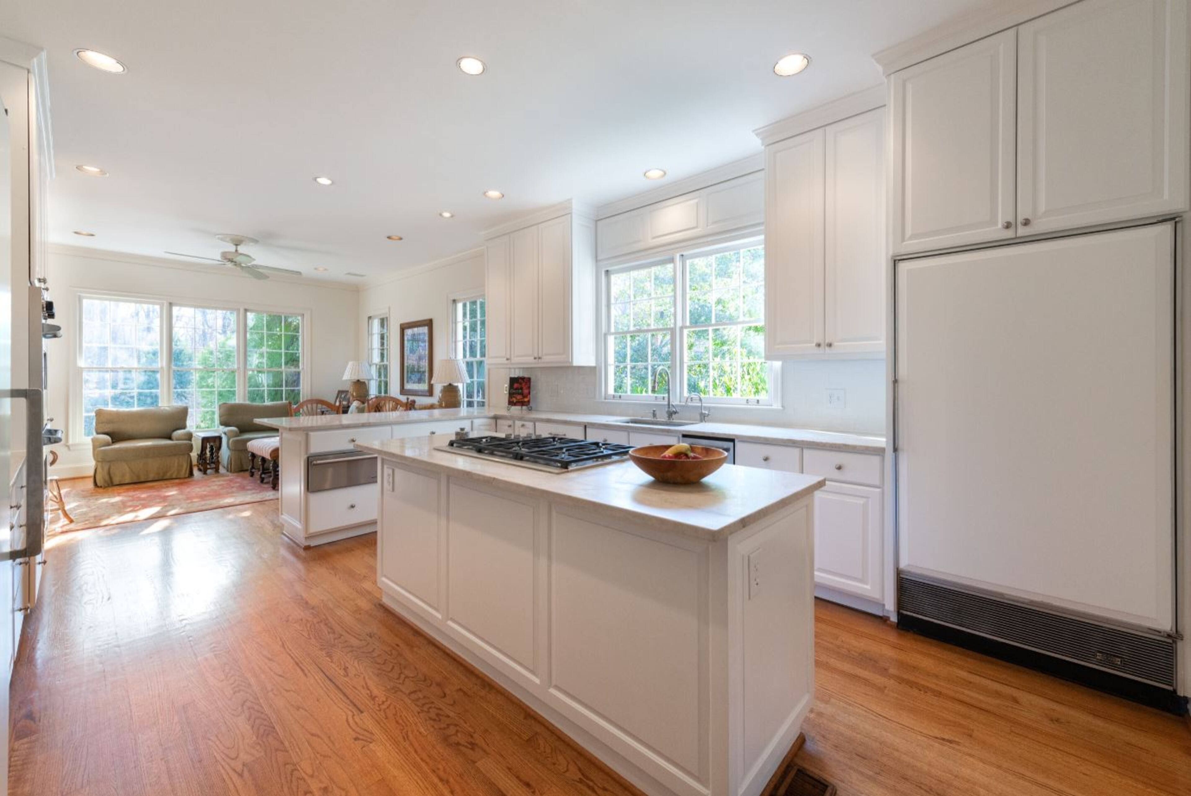 Listed by Sotheby’s agent Betsy Akers, the home has an updated kitchen decorated with white cabinets. There is also a home office, three-car garage and guest suite.