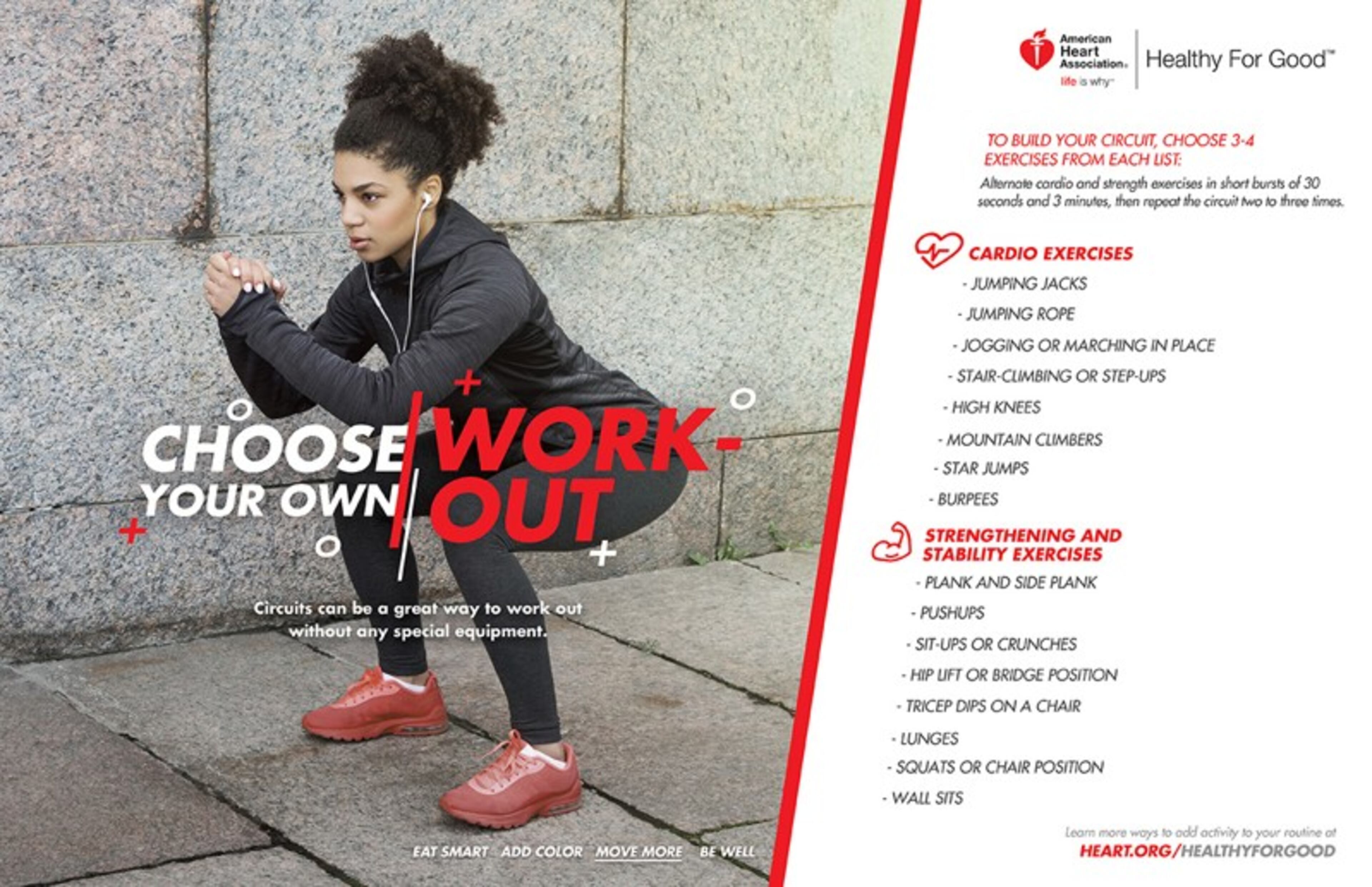 The American Heart Association has recommendations on its website for a simple circuit workout that can be done at home, including jumping jacks, high knees, push ups and lunges. It can be modified for individual use.