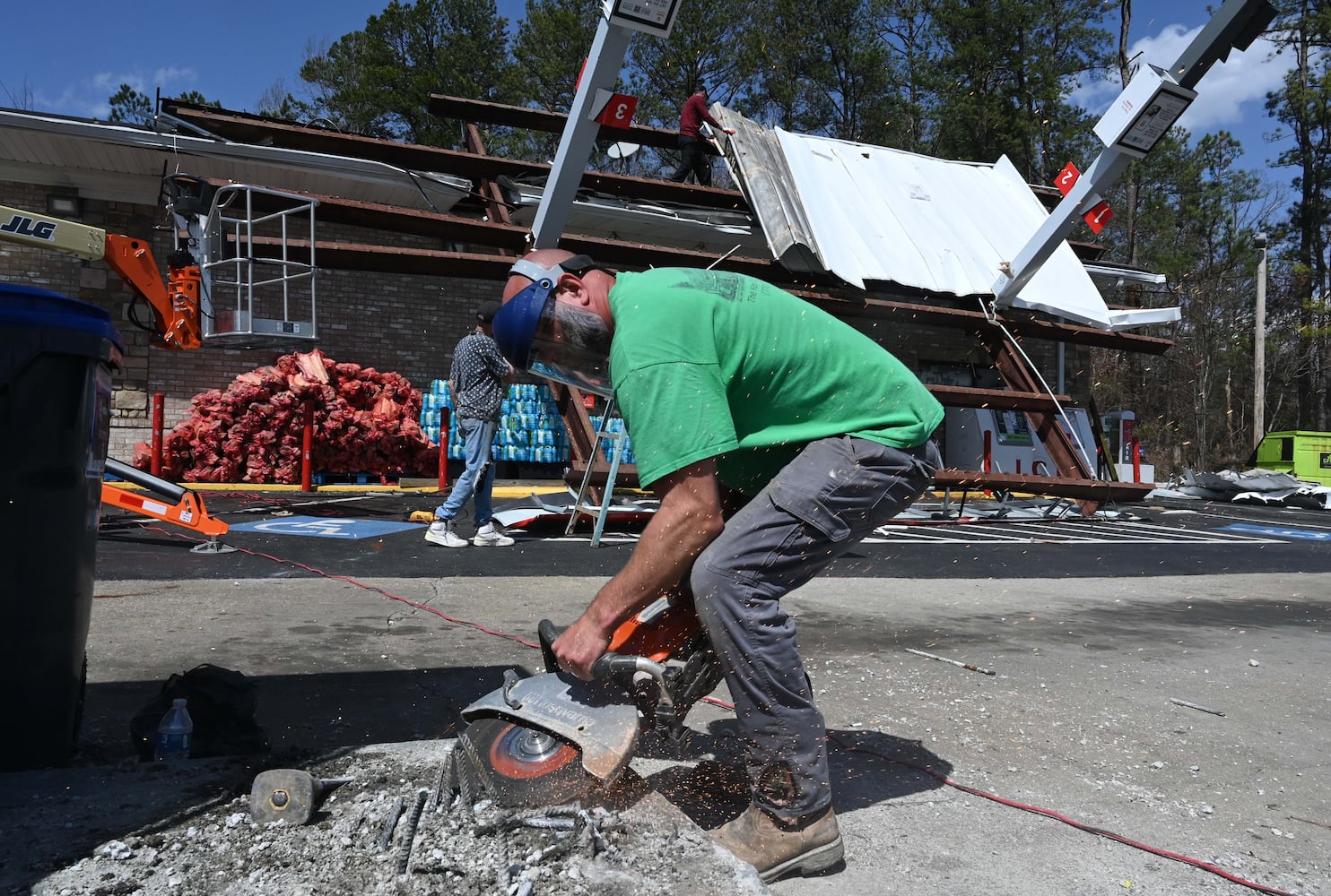 Workers, clean up damaged house near Paulding County High School after a storm passed through, Sunday, March 16, 2025, in Dallas. National Weather Service teams will be conducting a damage survey in the Paulding County/Dallas area, which sustained “pretty significant” damage from the storms, NWS Senior Meteorologist Dylan Lusk told The Atlanta Journal-Constitution on Sunday morning. (Hyosub Shin / AJC)