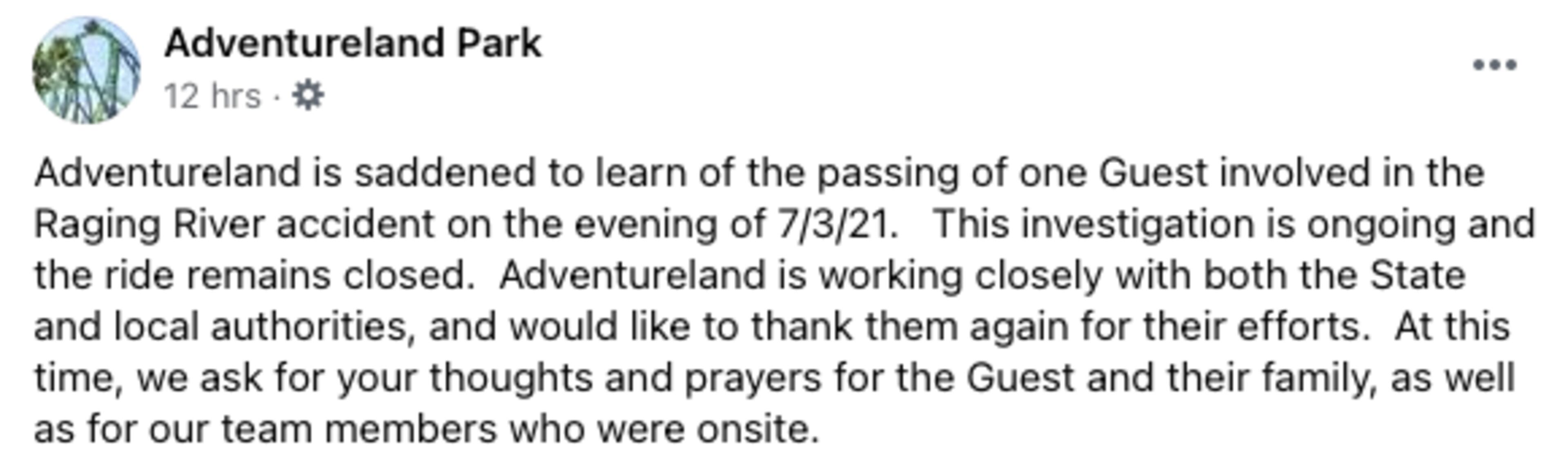 “Adventureland is saddened to learn of the passing of one Guest involved in the Raging River accident on the evening of 7/3/21,” the statement said. “This investigation is ongoing and the ride remains closed. Adventureland is working closely with both the State and local authorities, and would like to thank them again for their efforts. At this time, we ask for your thoughts and prayers for the Guest and their family, as well as for our team members who were onsite.”