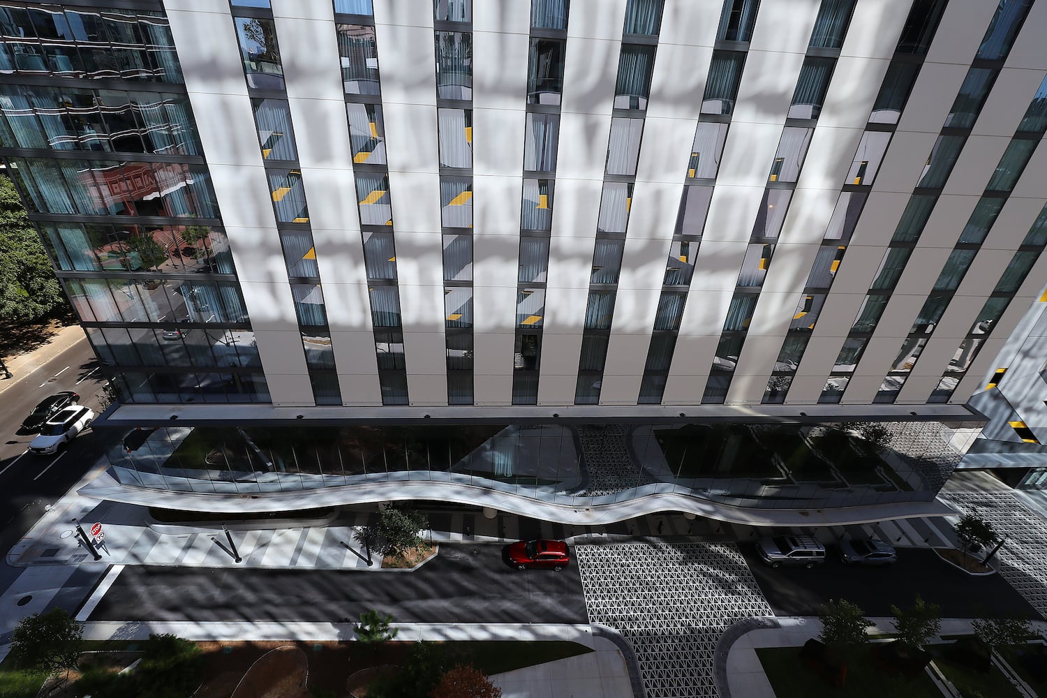 “The team came up with the concept of paying homage to the arts district right next door,” he said. “The exterior of the building is a white grid which is supposed to represent a sheet of music, and the gold balconies are the music notes that are on that page.”