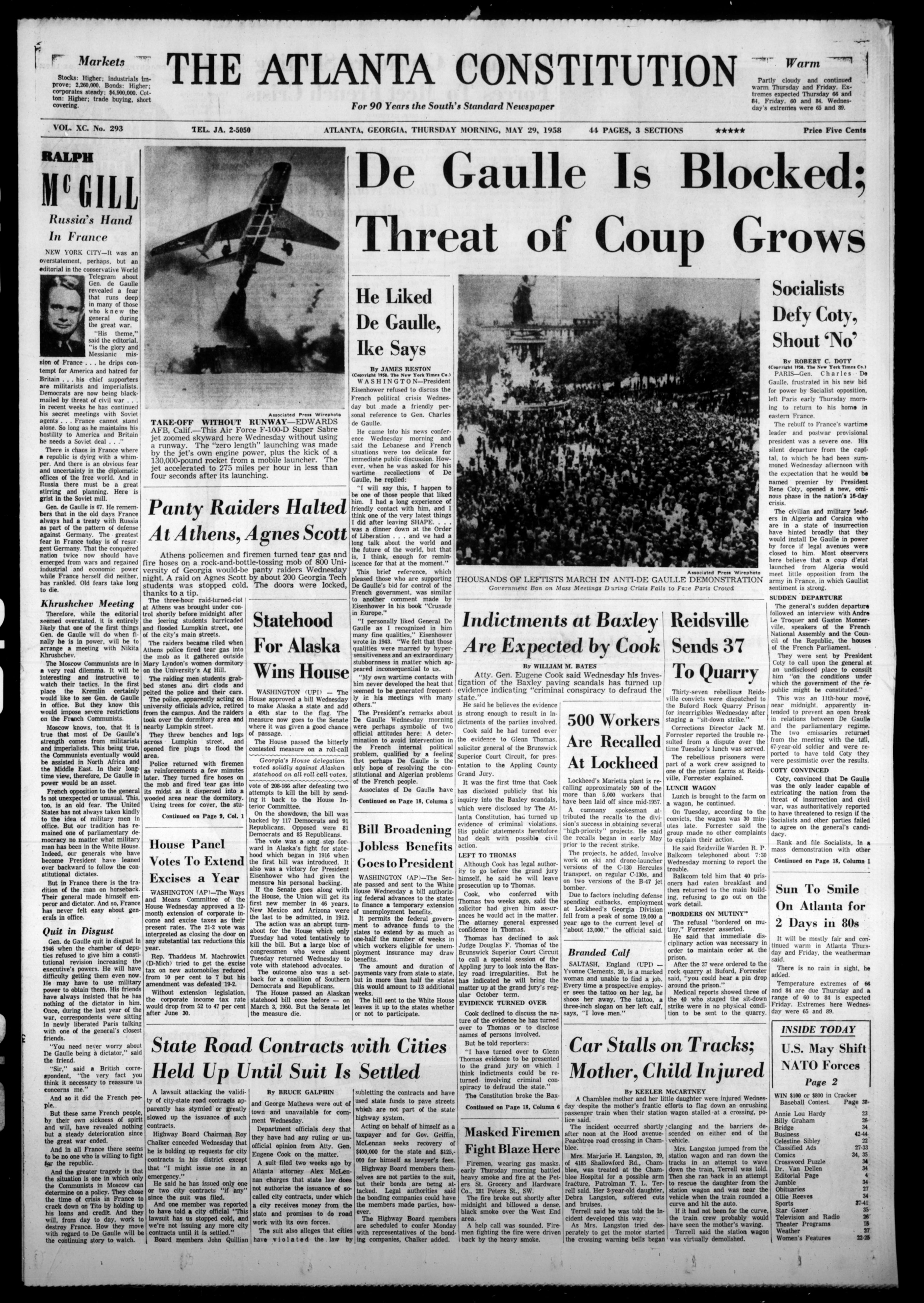 From the front page of The Atlanta Constitution: The House approved a bill Wednesday to make Alaska a state and add a 49th star to the flag … Georgia’s House delegation voted solidly against Alaskan statehood on all roll call votes.