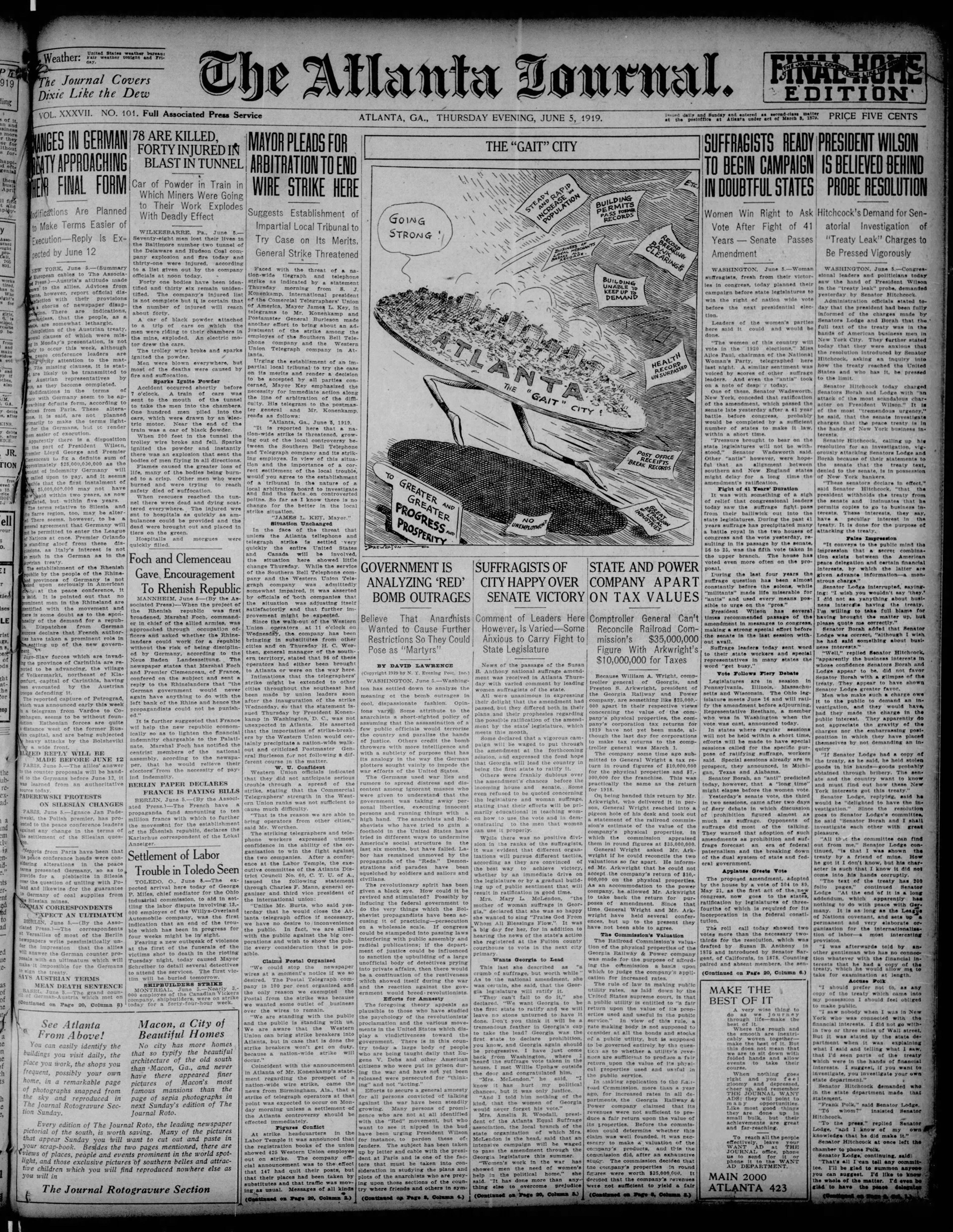 From the front page of The Atlanta Journal: Suffragists of city happy over Senate victory. News of the passage of the Susan B. Anthony national suffrage amendment was received in Atlanta Thursday with varied comment by leading women suffragists of the state. All were unanimous in expressing their delight that the amendment had passed, but they differed both in their plans and their prophesies regarding the possible ratification of the amendment by the state legislature ... Some ... expressed the fond hope that Georgia will lead the country in being the first state to ratify it.
