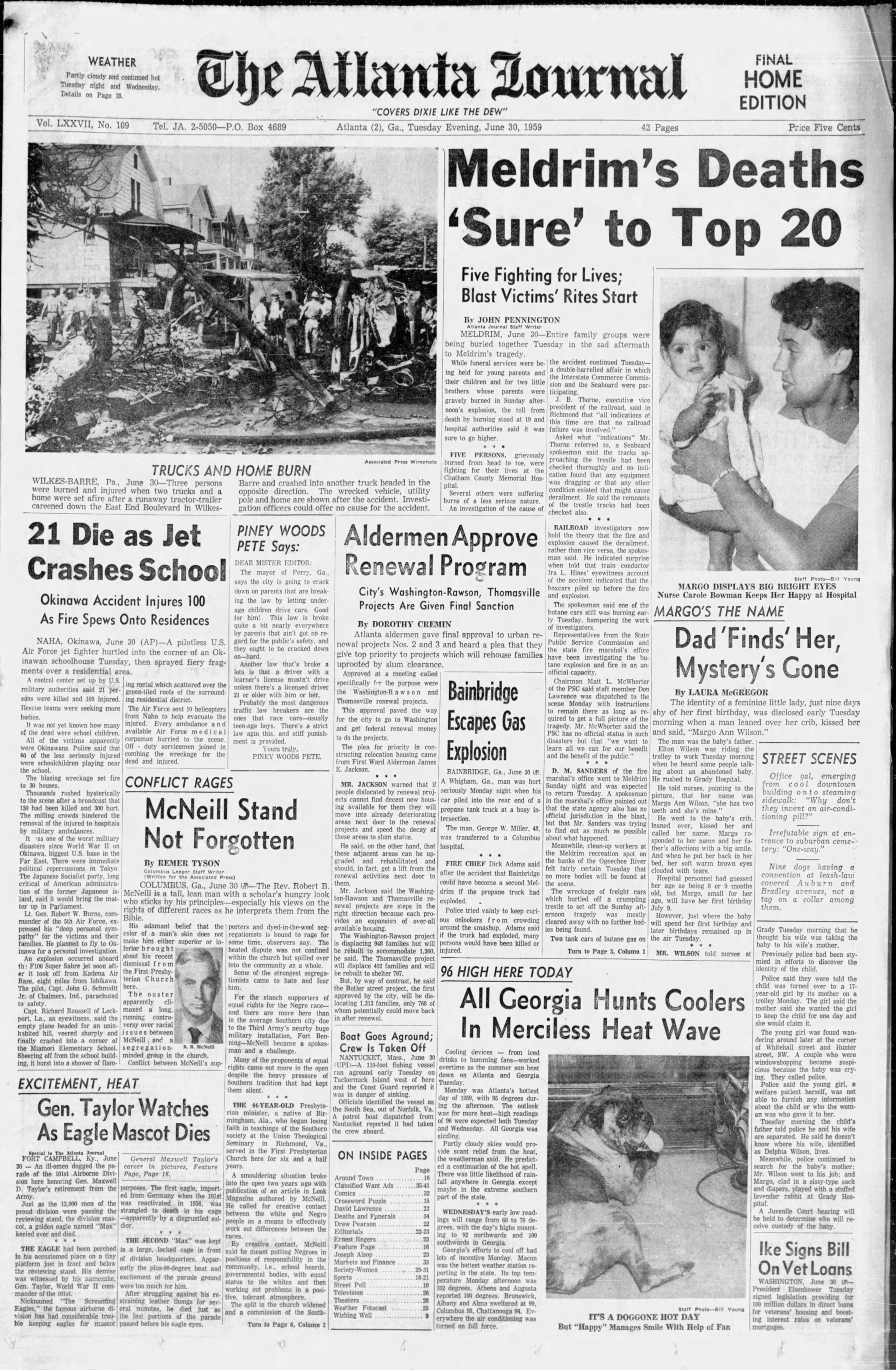 The Atlanta Journal — All Georgia hunts coolers in merciless heat wave. Cooling devices — from iced drinks to humming fans — worked overtime as the summer sun beat down on Atlanta and Georgia … Monday was Atlanta’s hottest day of 1959, with 95 degrees during the afternoon. The outlook was for more heat — high readings of 96 were expected both Tuesday and Wednesday. All Georgia was sizzling.