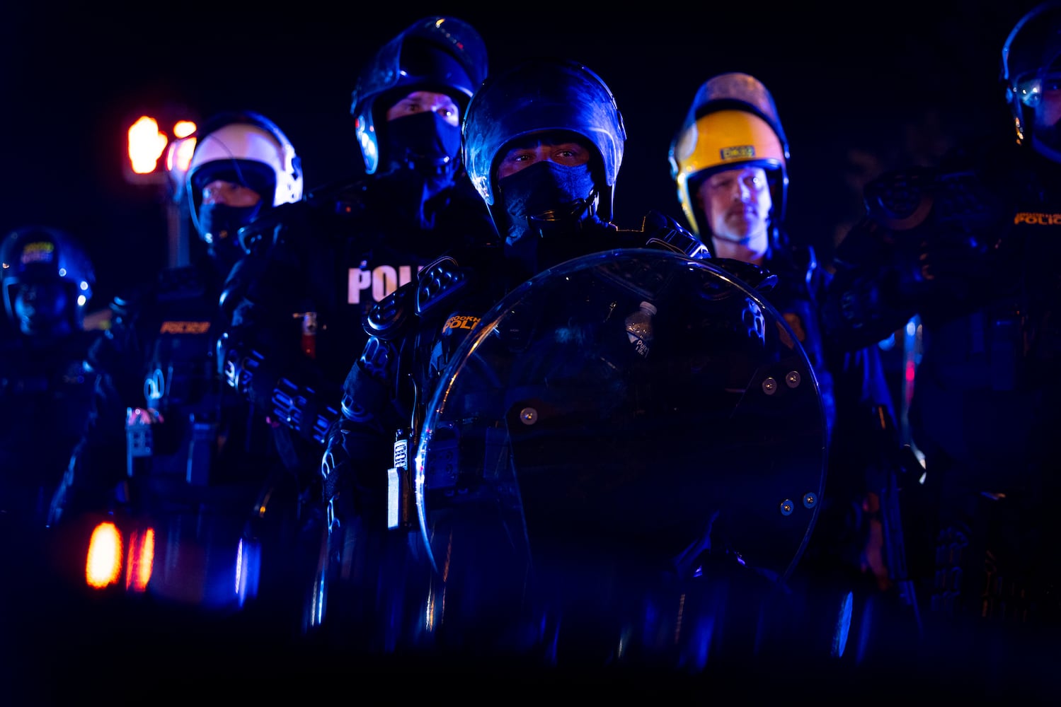 By 9:40 p.m., police in riot gear began trying to clear the area, eventually deploying tear gas. Protesters threw multiple canisters back. Half a dozen fireworks were also thrown at police and exploded at their feet.