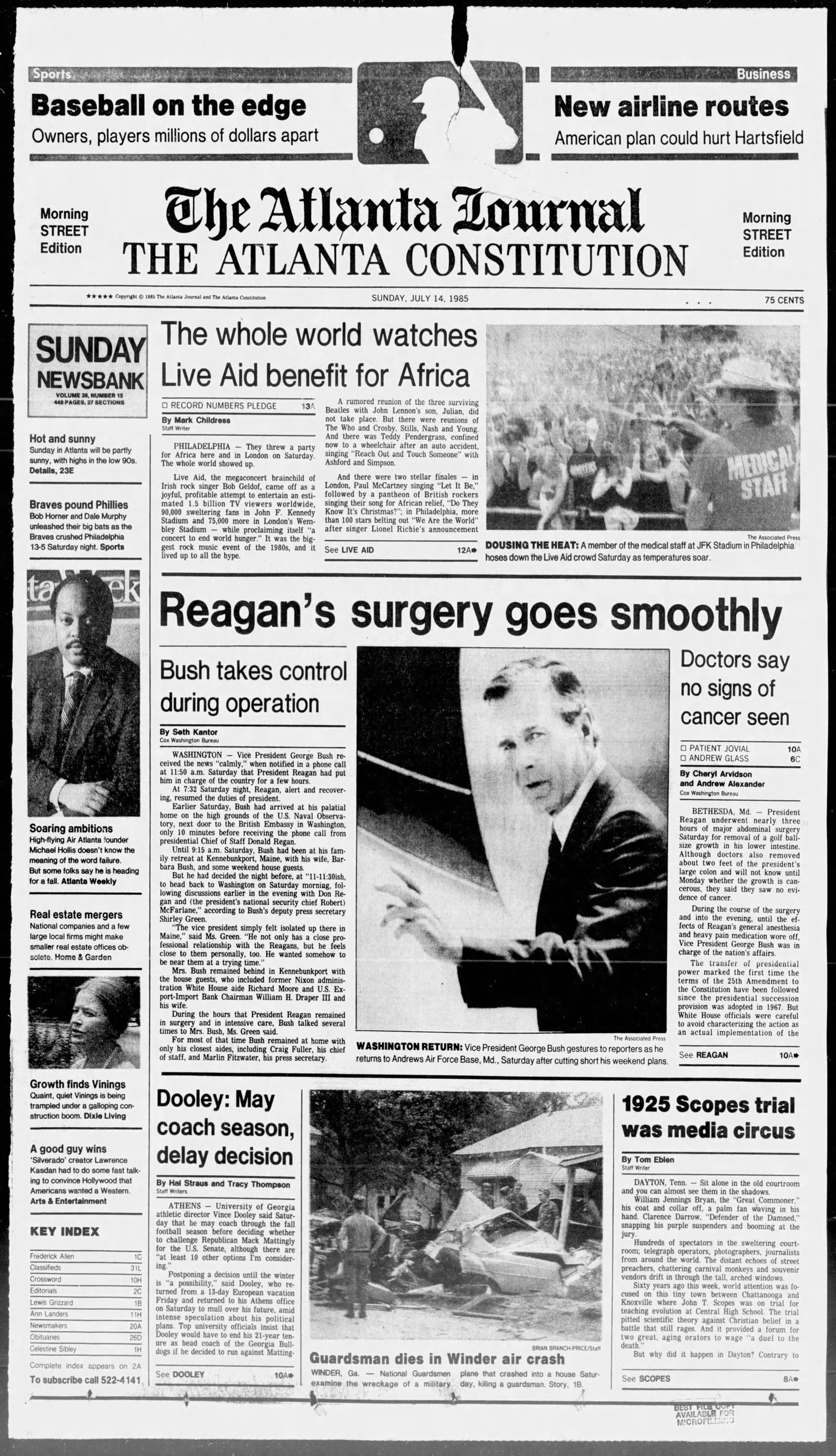 From the front page of The Atlanta Journal: The whole world watches Live Aid benefit for Africa. They threw a party for Africa here and in London on Saturday. The whole world showed up. Live Aid, the mega concert brainchild of Irish rock singer Bob Geldof, came off as a joyful, profitable attempt to entertain an estimated 1.5 billion TV viewers worldwide, 90,000 sweltering fans in John F. Kennedy Stadium and 75,000 more in London’s Wembley Stadium — while proclaiming itself “a concert to end world hunger.”