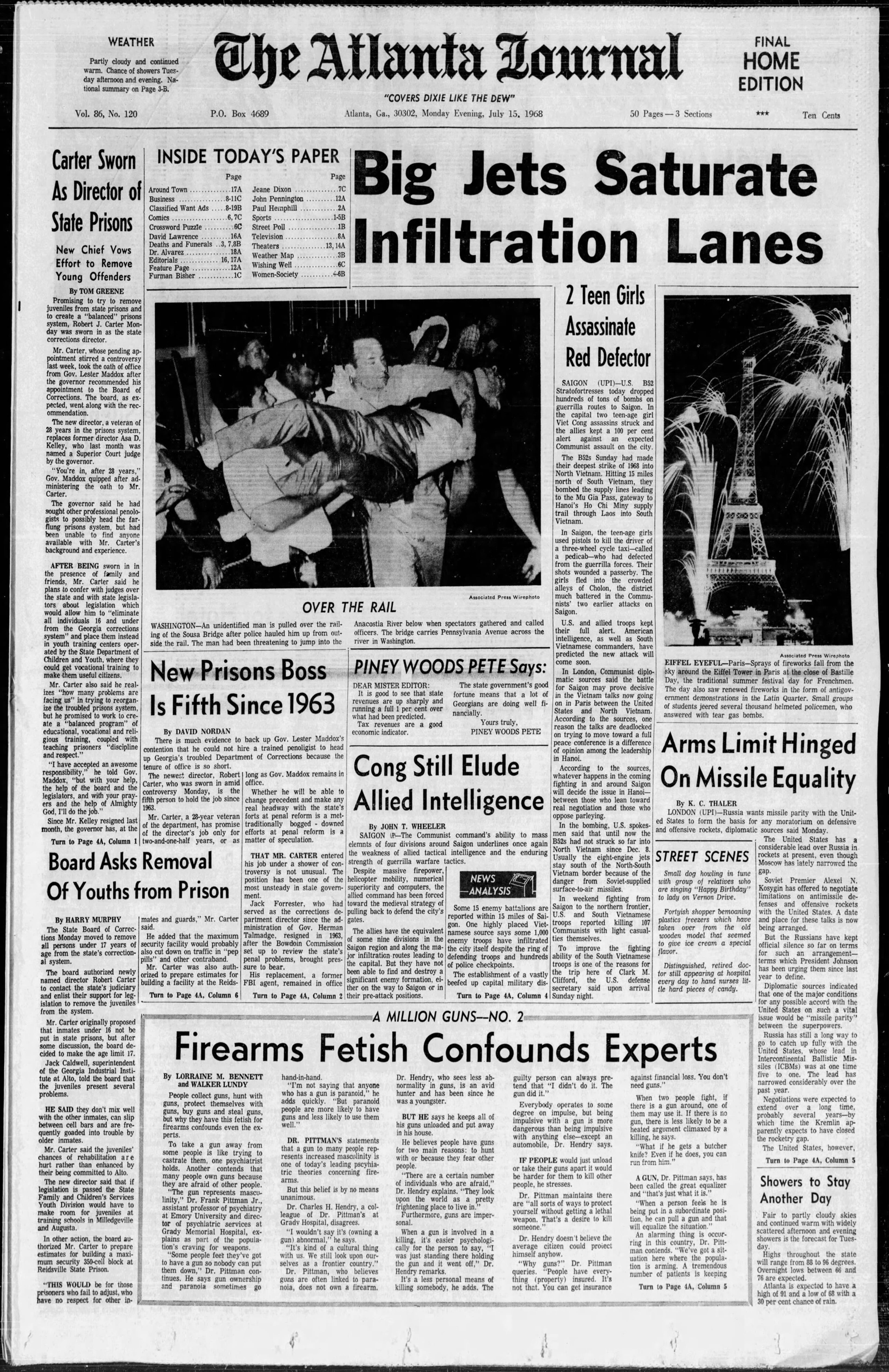 From the front page of The Atlanta Journal: Firearms Fetish Confounds Experts. To take a gun away from some people is like trying to castrate them, one psychiatrist holds. Another contends that many people own guns because they are afraid of other people. “The gun represents masculinity,” Dr. Frank Pittman Jr. ... explains as part of the population’s craving for weapons.