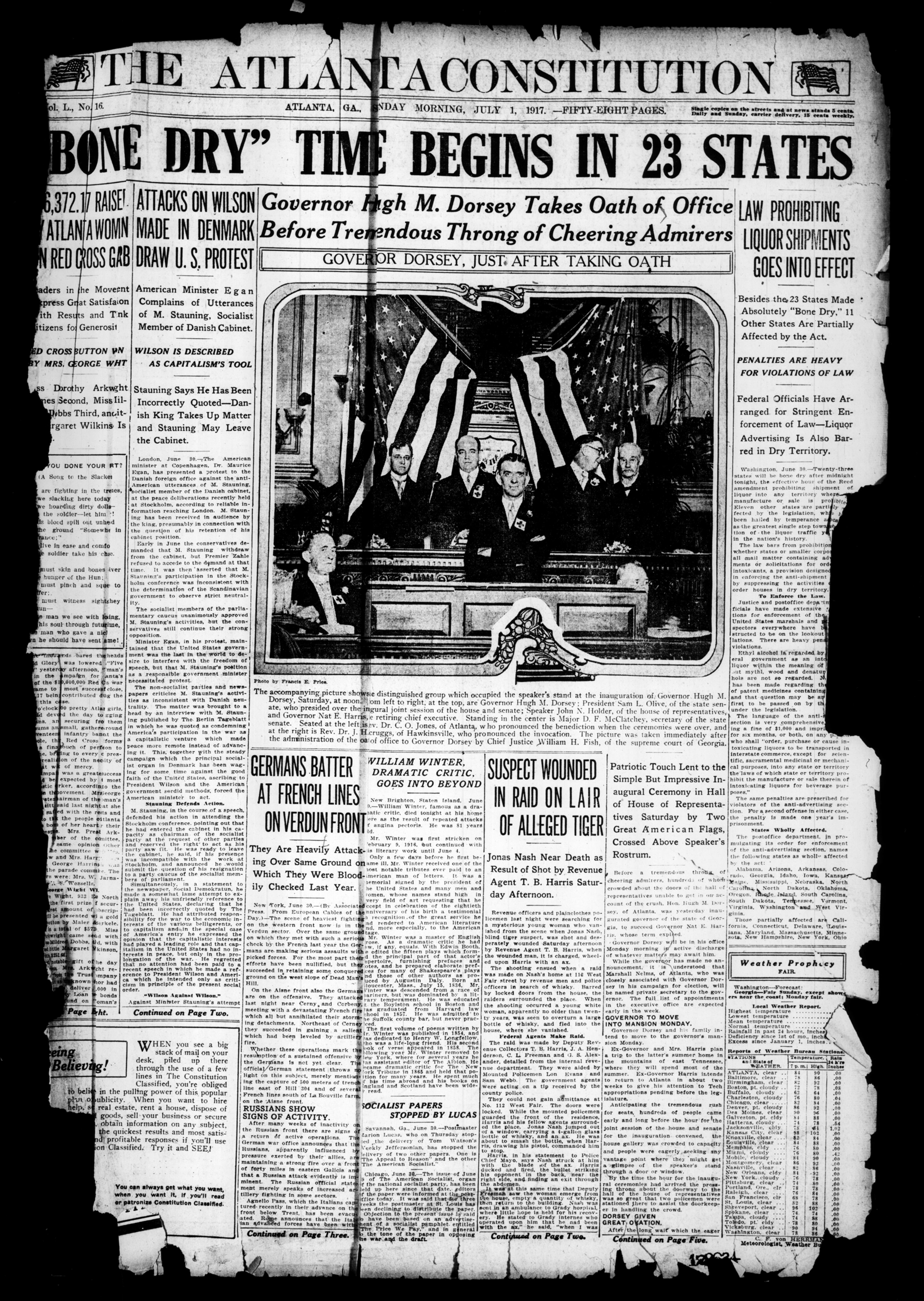 The Atlanta Constitution — “Bone dry” time begins in 23 states; law prohibiting liquor shipments goes into effect. Twenty-three states will be bone dry after midnight tonight, the effective hour of the Reed amendment … Eleven other states are partially affected by the legislation.