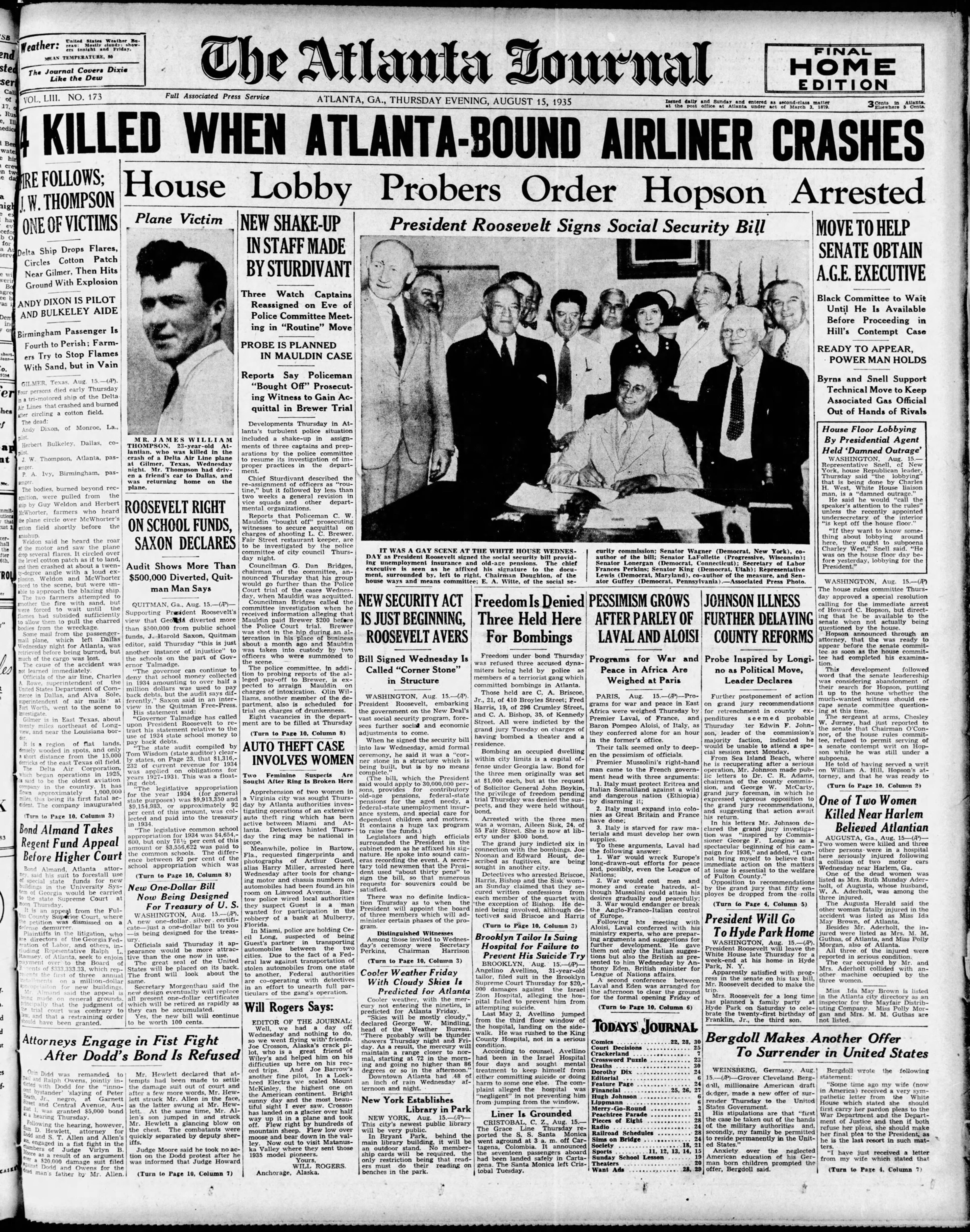 From the front page of The Atlanta Journal: President Roosevelt signs Social Security bill; new security act is just beginning, Roosevelt avers. President Roosevelt, embarking the government on the New Deal’s vast social security program, foresees further social and economic adjustments to come. When he signed the security bill into law Wednesday, amid formal ceremony, he said it was a “corner stone in a structure which is being built but is by no means complete.”
