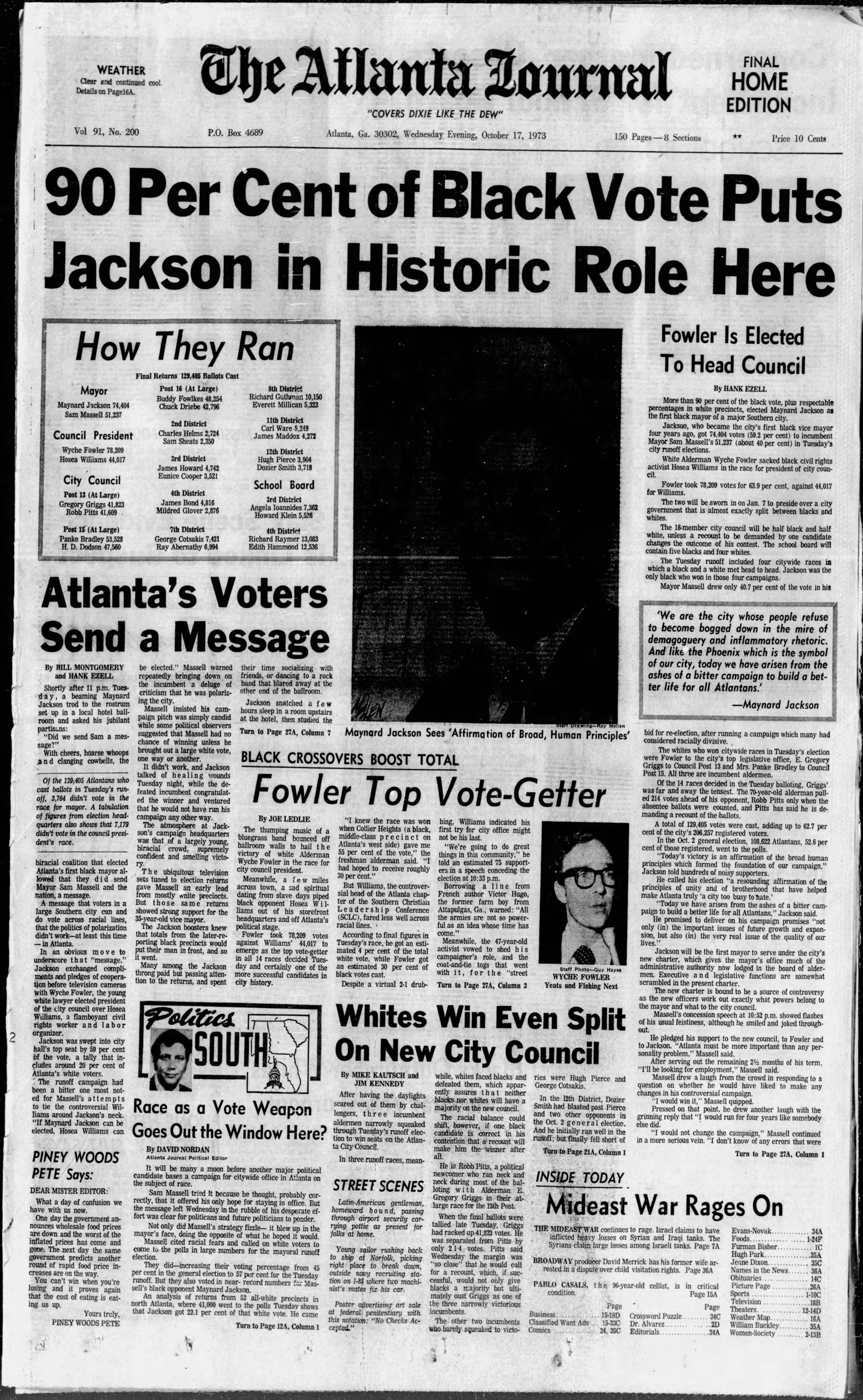 90 percent of Black vote puts Jackson in historic role here. Shortly after 11 p.m. Tuesday, a beaming Maynard Jackson trod to the rostrum set up in a local hotel ballroom and asked his jubilant partisans: “Did we send Sam a message?” With cheers, hoarse whoops and clanging cowbells, the biracial coalition that elected Atlanta’s first Black mayor allowed that they did send Mayor Sam Massell and the nation, a message. A message that voters in a large Southern city can and do vote across racial lines, that the politics of polarization didn’t work — at least this time — in Atlanta.
