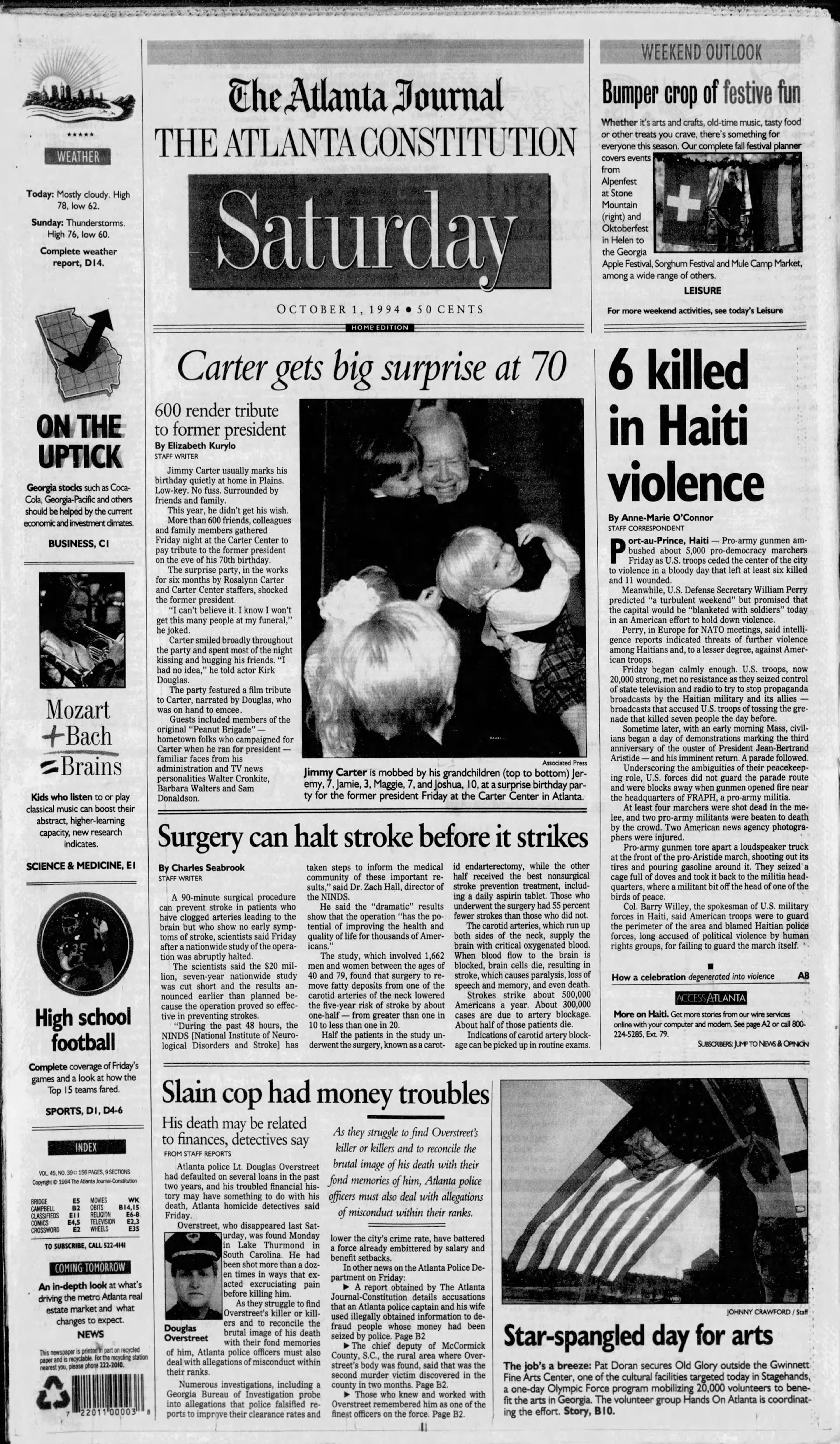Carter gets big surprise at 70. Jimmy Carter usually marks his birthday quietly at home in Plains. Low-key. No fuss. Surrounded by friends and family. This year, he didn’t get his wish. More than 600 friends, colleagues and family members gathered Friday night at the Carter Center to pay tribute to the former president … “I can’t believe it. I know I won’t get this many people at my funeral,” he joked. Carter smiled broadly throughout the party and spent most of the night kissing and hugging his friends. “I had no idea,” he told actor Kirk Douglas.