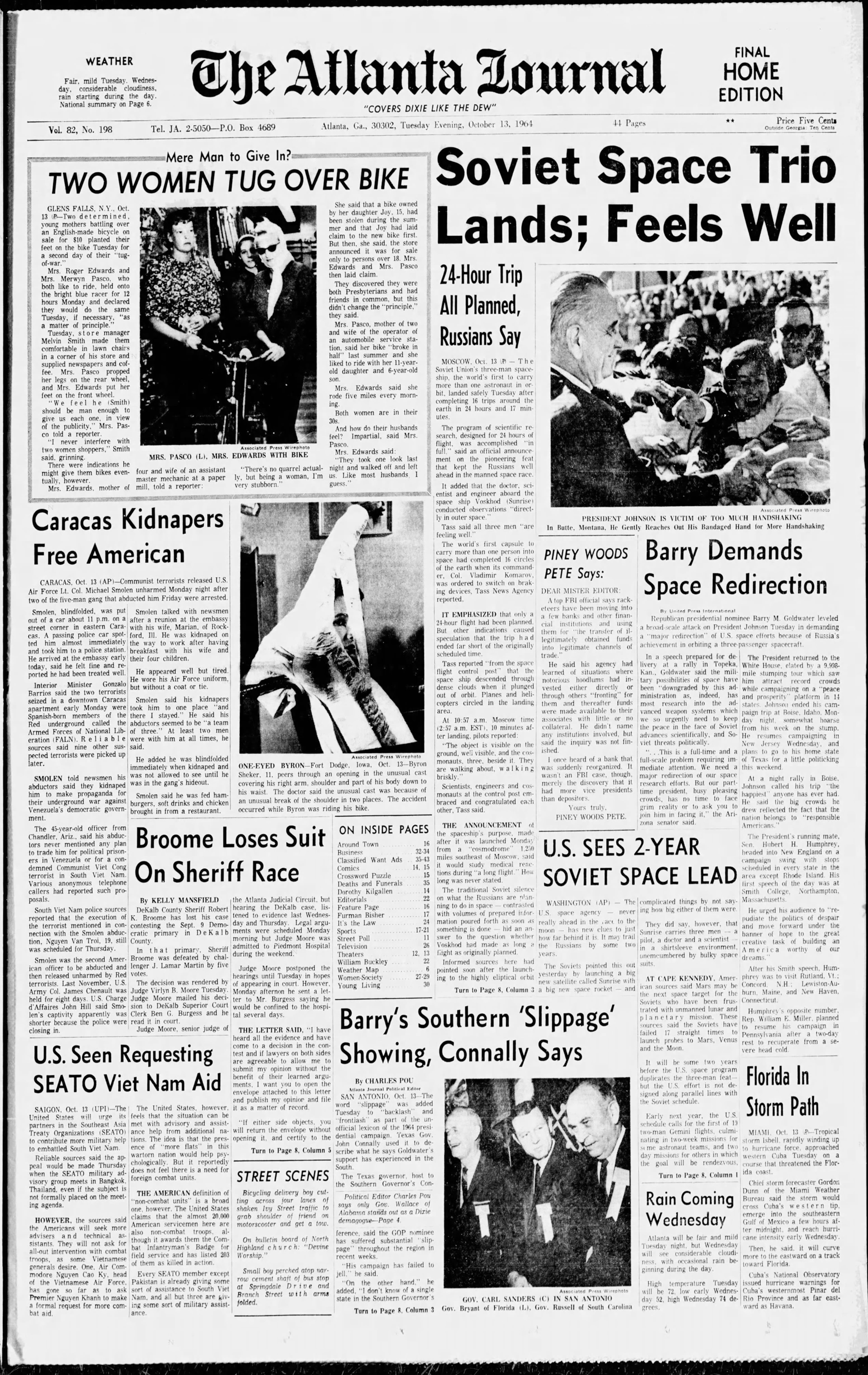 Soviet space trio lands; feels well. The Soviet Union’s three-man spaceship, the world’s first to carry more than one astronaut in orbit, landed safely Tuesday after completing 16 trips around the earth in 24 hours and 17 minutes.