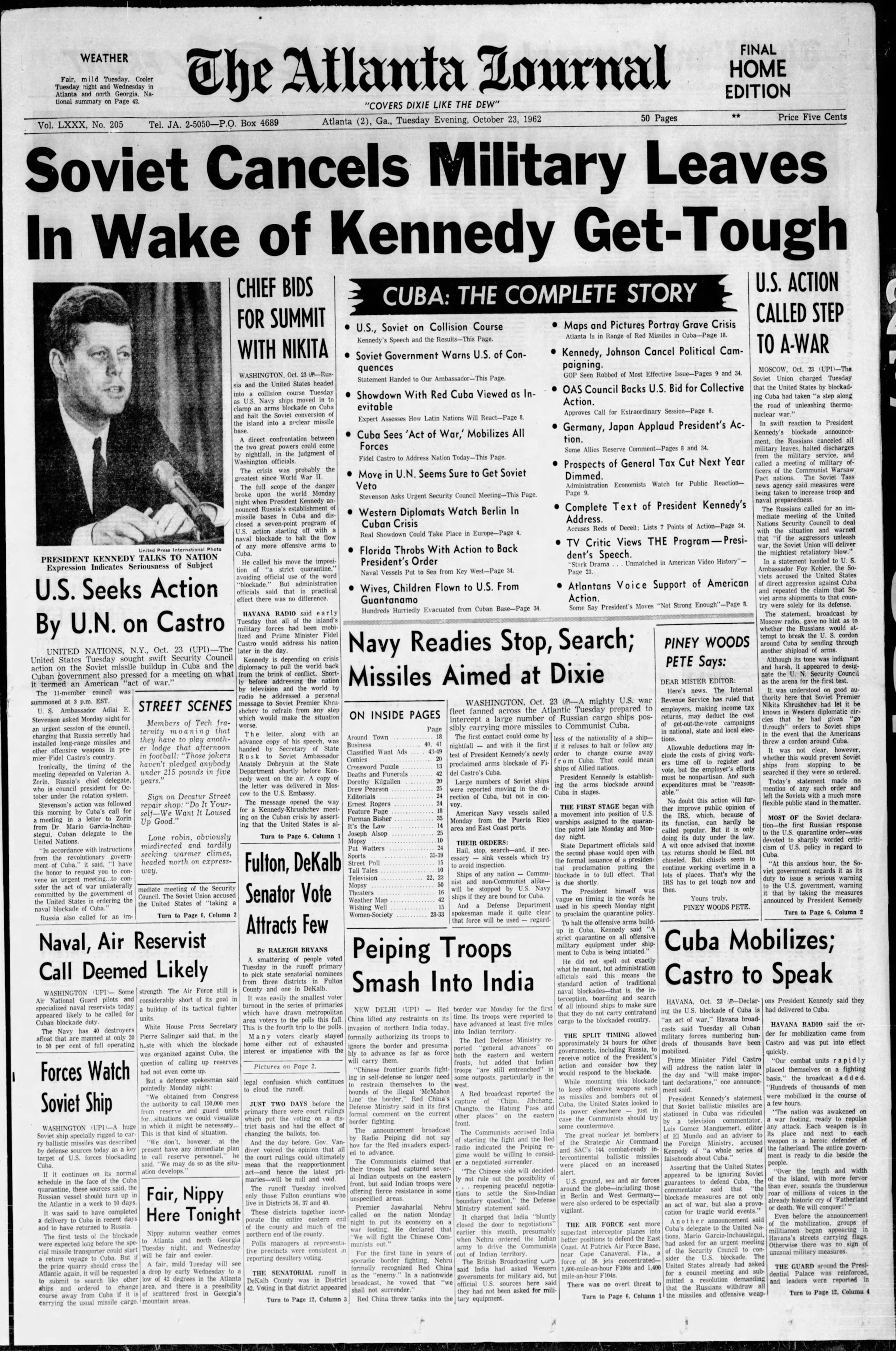 Soviet cancels military leaves in wake of Kennedy get-tough. Russia and the United States headed into a collision course Tuesday as U.S. Navy ships moved in to clamp an arms blockade on Cuba and halt the Soviet conversion of the island into a nuclear missile base. A direct confrontation between the two great powers could come by nightfall, in the judgment of Washington officials. The crisis was probably the greatest since World War II.