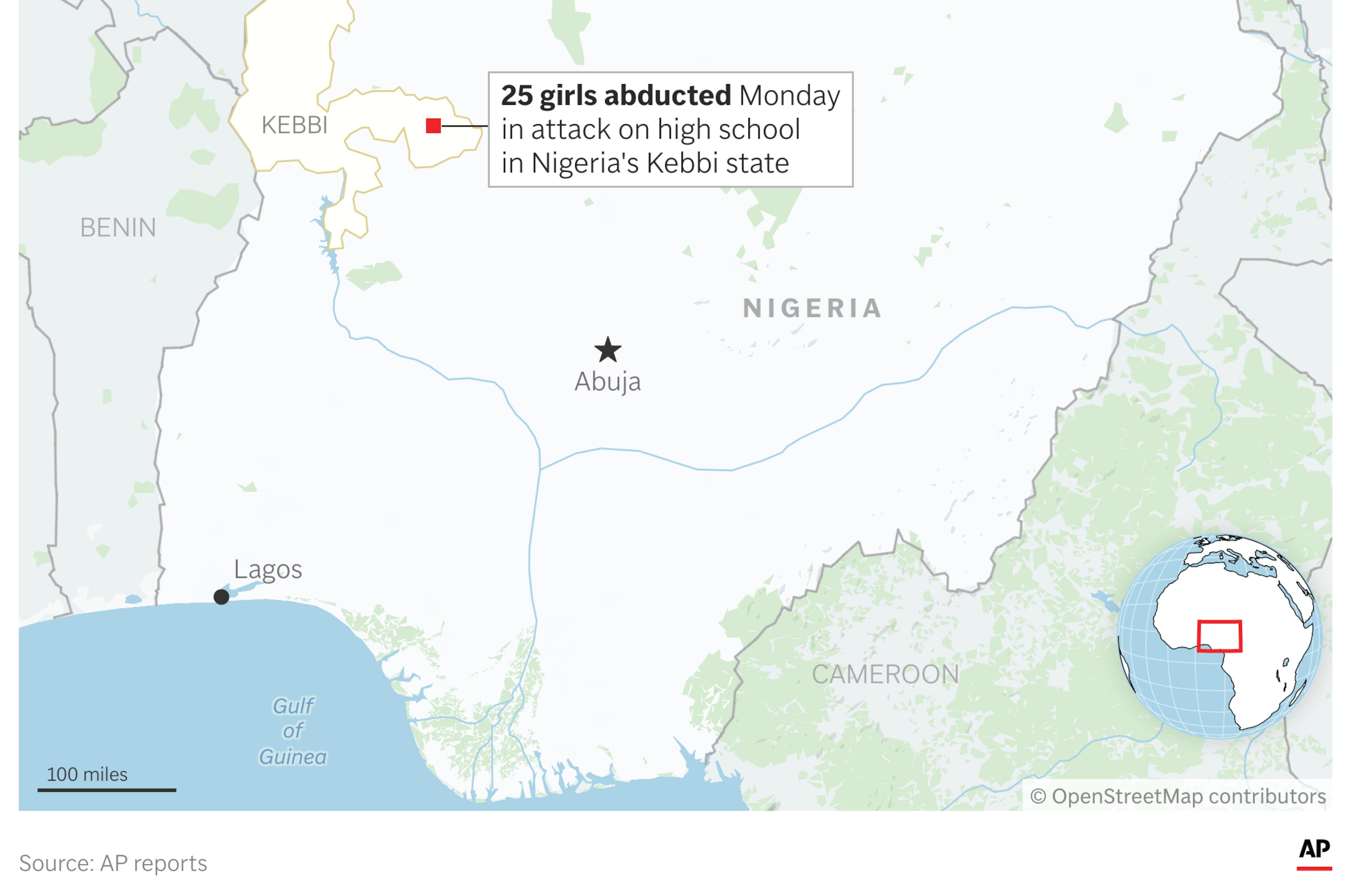 No group has claimed responsibility for taking the girls, but analysts and locals say gangs of bandits often target schools, travelers and remote villagers in kidnappings for ransoms. Authorities say the bandits are mostly former herders who have taken up arms against farming communities after clashes between them over strained resources.