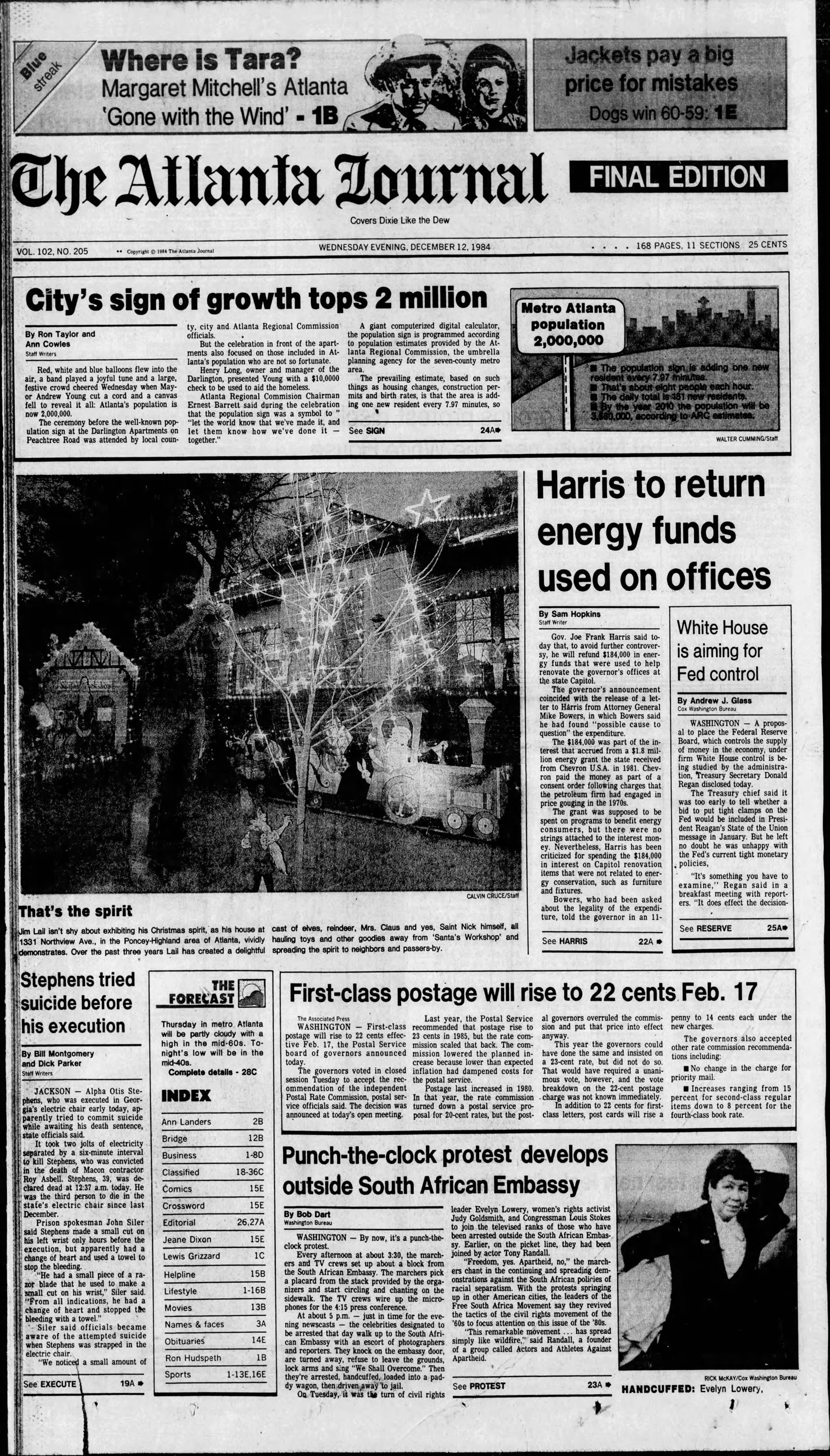 City’s sign of growth tops 2 million. Red, white and blue balloons flew into the air, a band played a joyful tune and a large, festive crowd cheered Wednesday when Mayor Andrew Young cut a cord and a canvas fell to reveal it all: Atlanta’s population is now 2,000,000. The ceremony before the well-known population sign at the Darlington Apartments on Peachtree Road was attended by local county, city and Atlanta Regional Commission officials. … (ARC) Chairman Ernest Barrett said during the celebration that the population sign was a symbol to “let the world know that we’ve made it, and let them know how we’ve done it — together.”