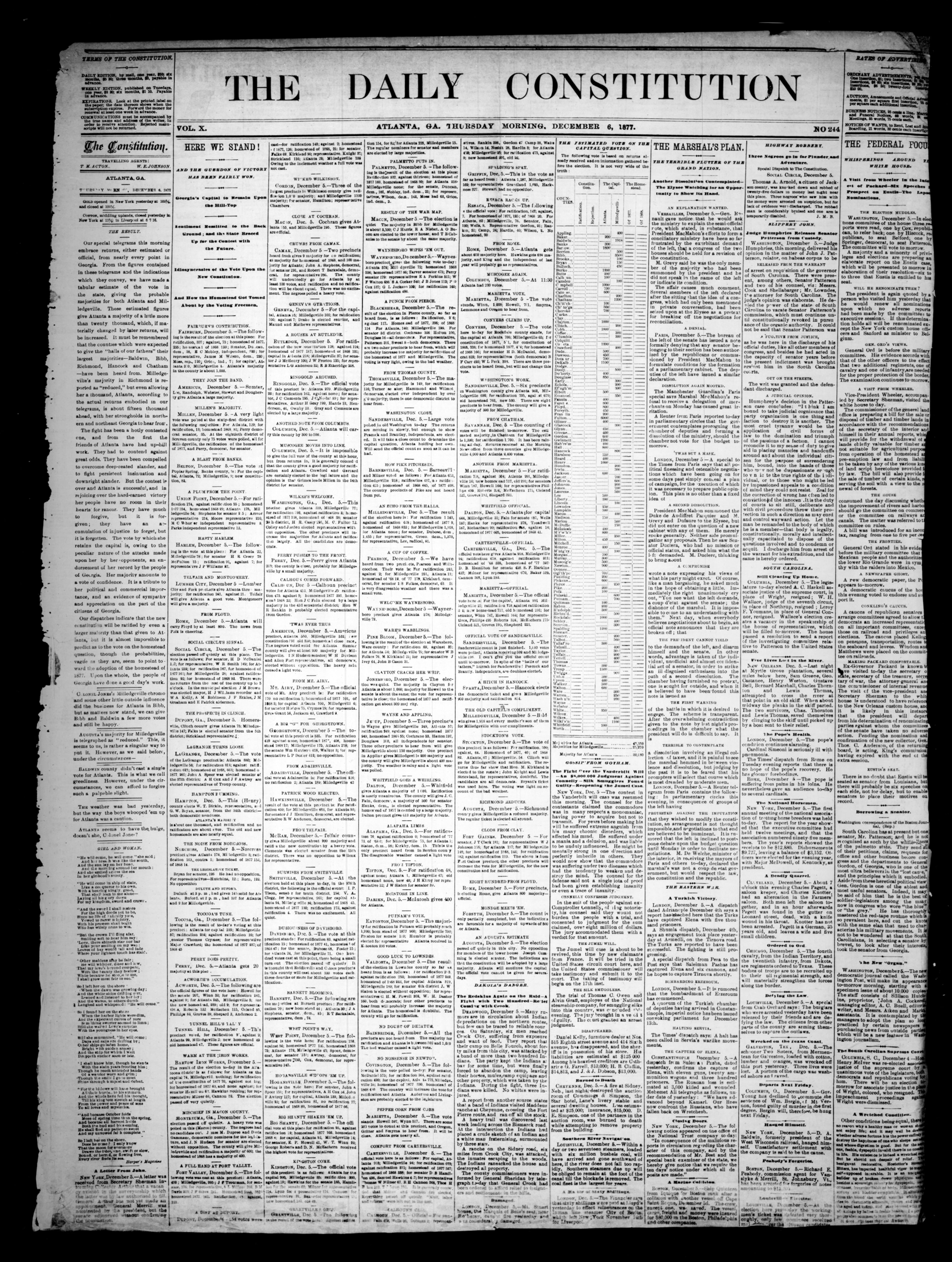 The result. Our special telegrams this morning embrace returns, either estimated or official, from nearly every point in Georgia. … These estimated figures give Atlanta a majority of a little more than twenty thousand, which, if materially changed by later returns, will be increased. … The fight has been a hotly contested one, and from the first the friends of Atlanta have had up-hill work. … But the contest is over and Atlanta is successful, and in rejoicing over the hard-earned victory her people have no room in their hearts for rancor.