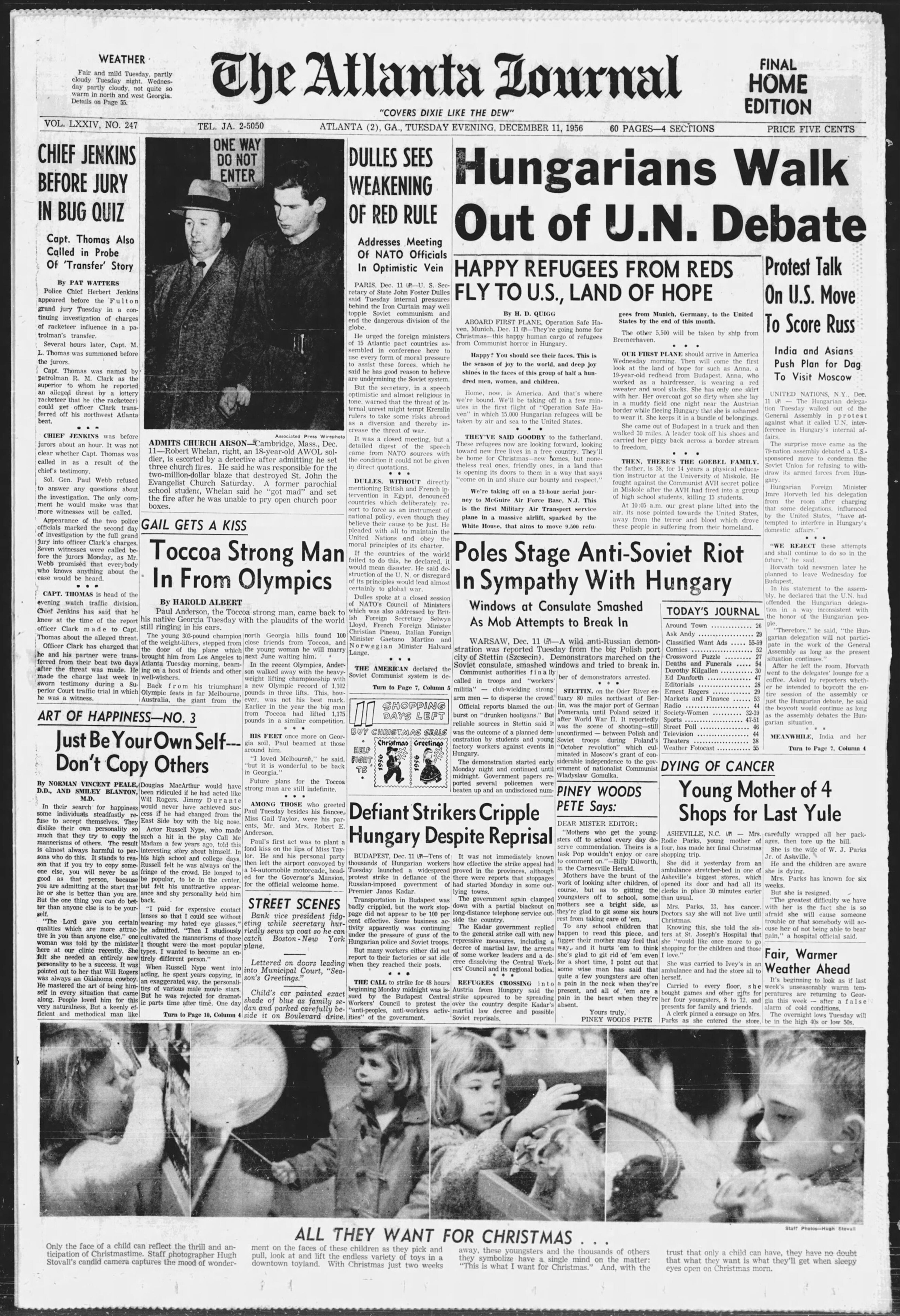 The Atlanta Journal — Toccoa strong man in from Olympics. Paul Anderson, the Toccoa strong man, came back to his native Georgia Tuesday with the plaudits of the world still ringing in his ears. … Back from his triumphant Olympic feats in far Melbourne, Australia, the giant from the north Georgia hills found 100 close friends from Toccoa, and the young woman he will marry next June waiting (for) him. In the recent Olympics, Anderson walked away with the heavyweight lifting championship with a new Olympic record of 1,102 pounds in three lifts.