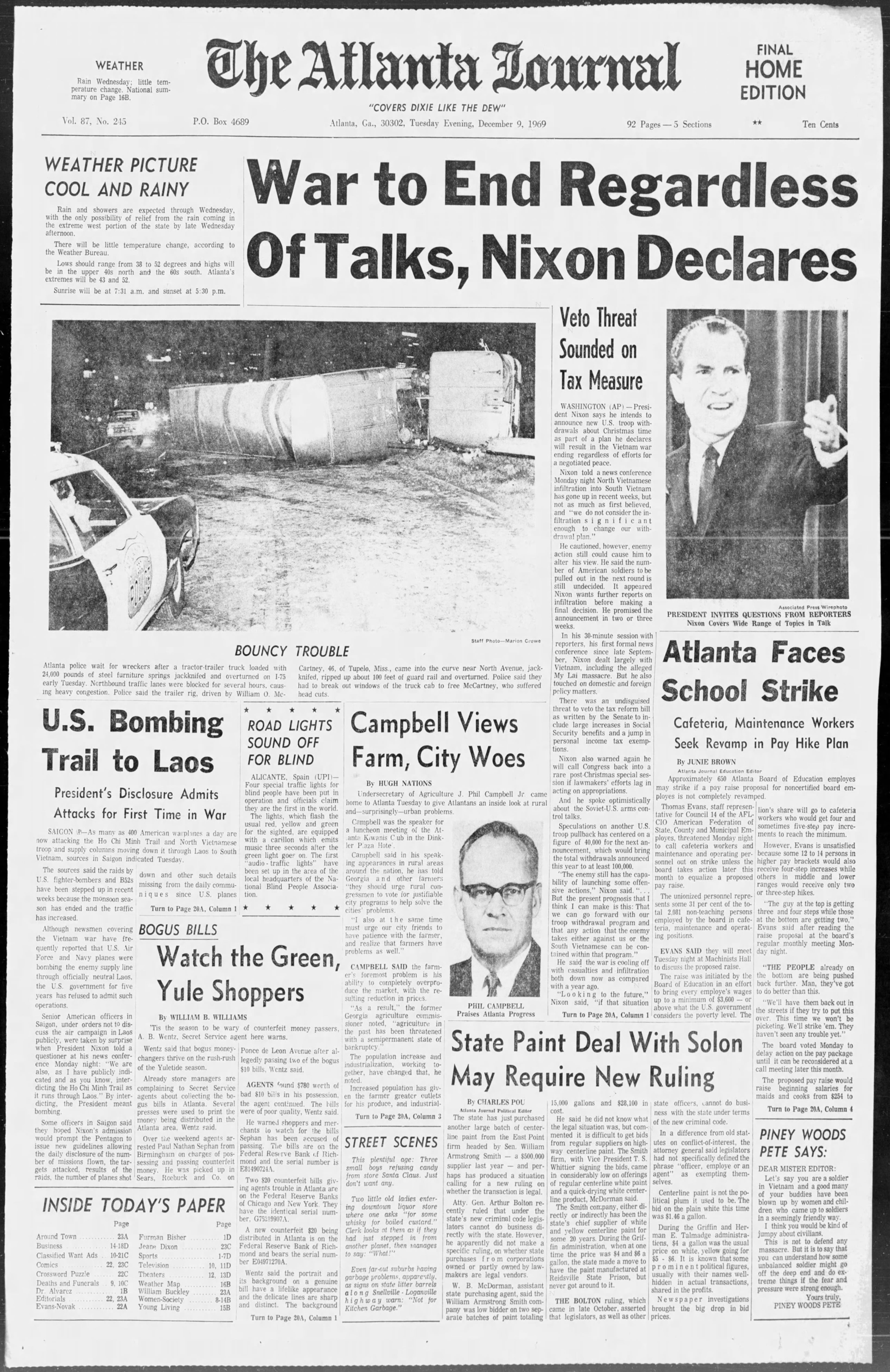 War to end regardless of talks, Nixon declares. President Nixon says he intends to announce new U.S. troop withdrawals about Christmas time as part of a plan he declares will result in the Vietnam War ending regardless of efforts for a negotiated peace. … He said the war is cooling off with casualties and infiltration both down now as compared with a year ago.