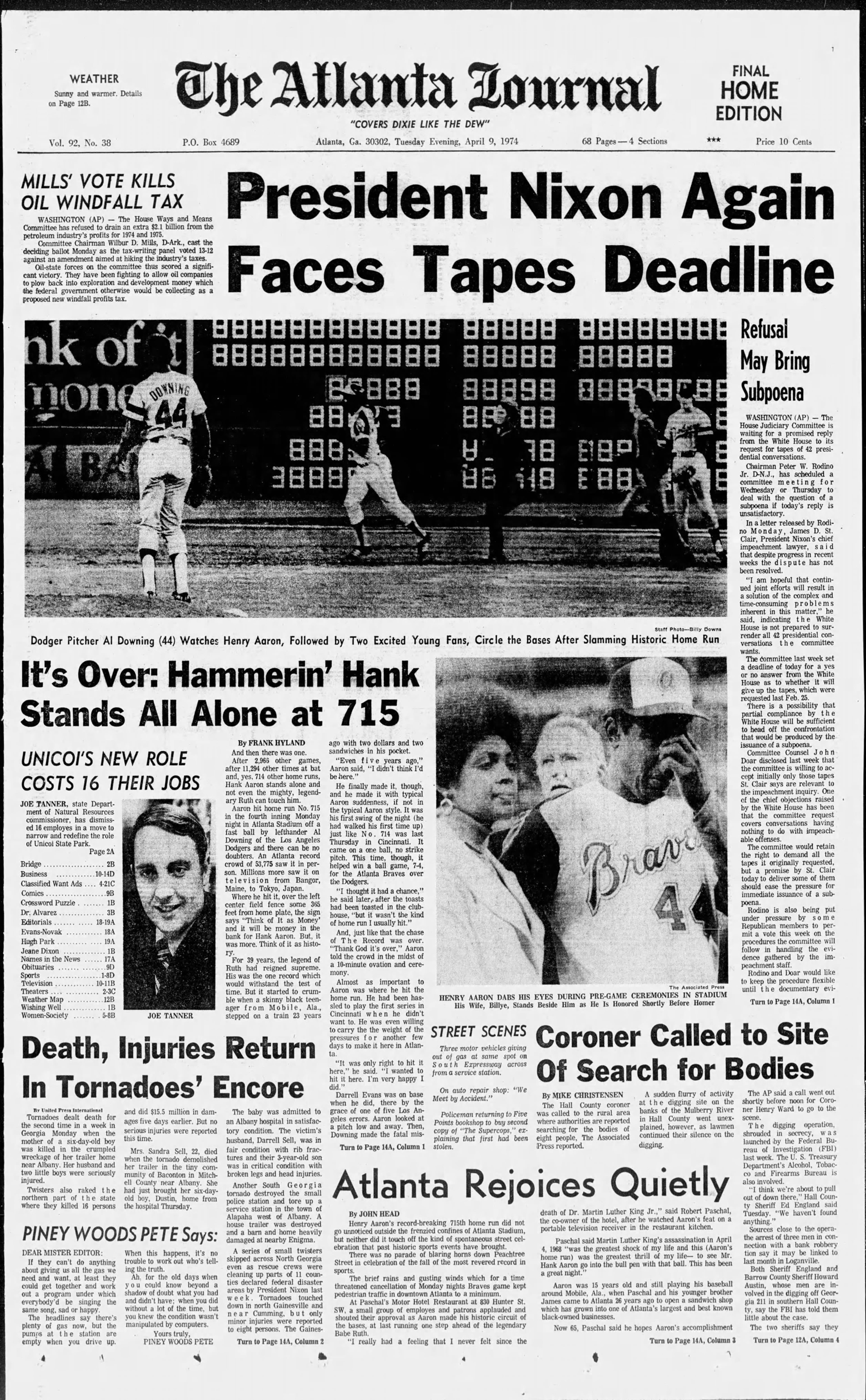 It’s over: Hammerin’ Hank stands all alone at 715. And then there was one. After 2,966 other games, after 11,294 other times at bat and, yes, 714 other home runs, Hank Aaron stands alone and not even the mighty, legendary Ruth can touch him. Aaron hit home run No. 715 in the fourth inning Monday night in Atlanta Stadium off a fast ball by lefthander Al Downing of the Los Angeles Dodgers and there can be no doubters. … “It was only right to hit it here,” (Aaron) said. “I wanted to hit it here. I’m very happy I did.”