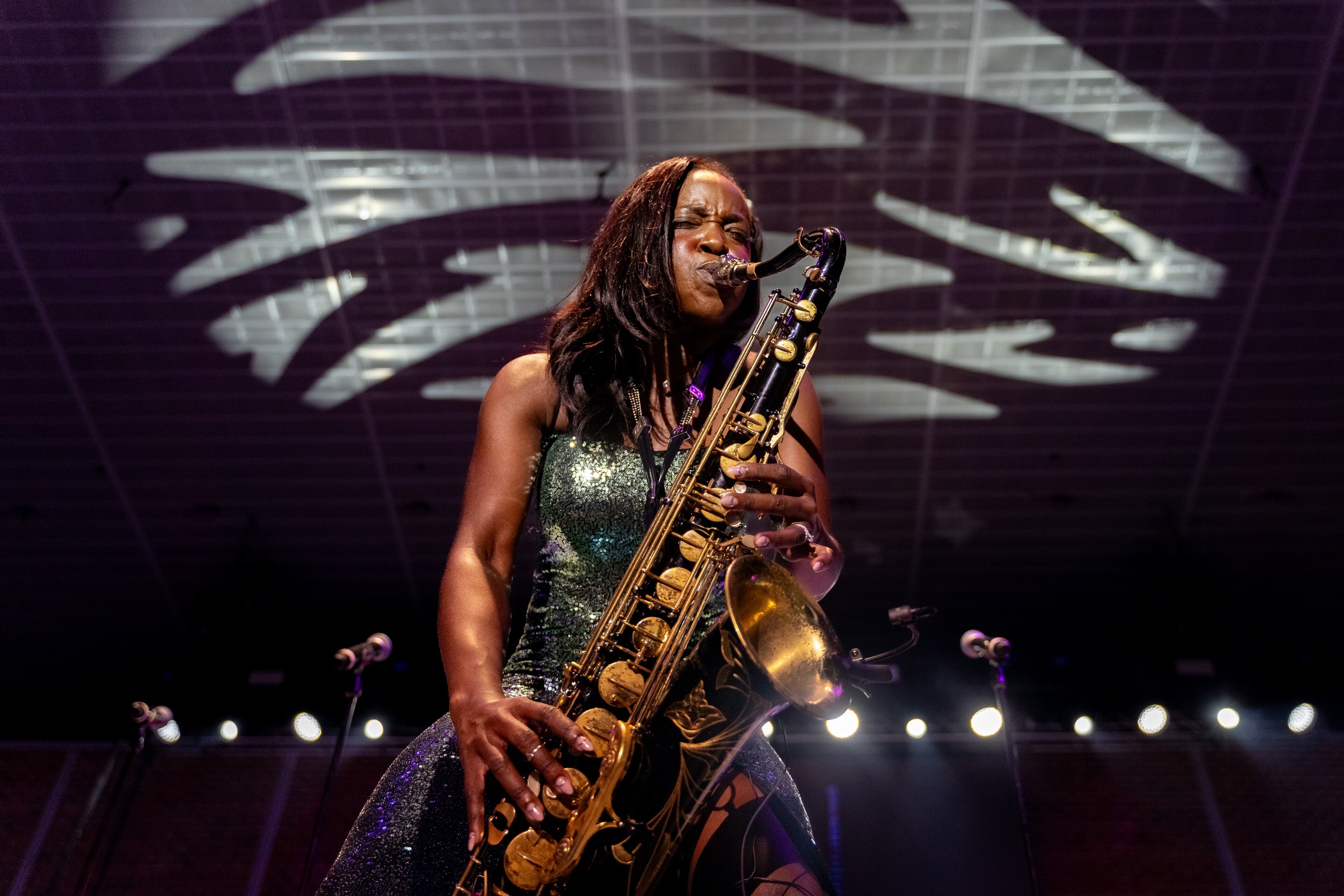 AJC contributor Ben Hendren captured saxophonist Jazmin Ghent rocking a solo during the Karen Briggs Contempo Orchestra’s weekend show at the Stockbridge Amphitheater.